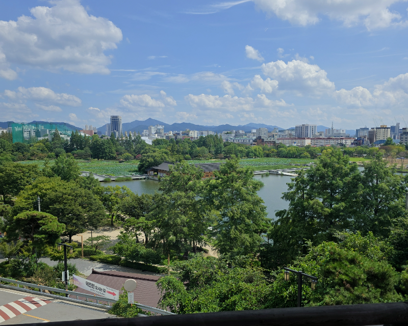 무엇보다 통창으로 보이는 덕진공원 뷰가 압권이었어요. 연못에 피어있는 연꽃들이 한 폭의 그림 같더라고요.