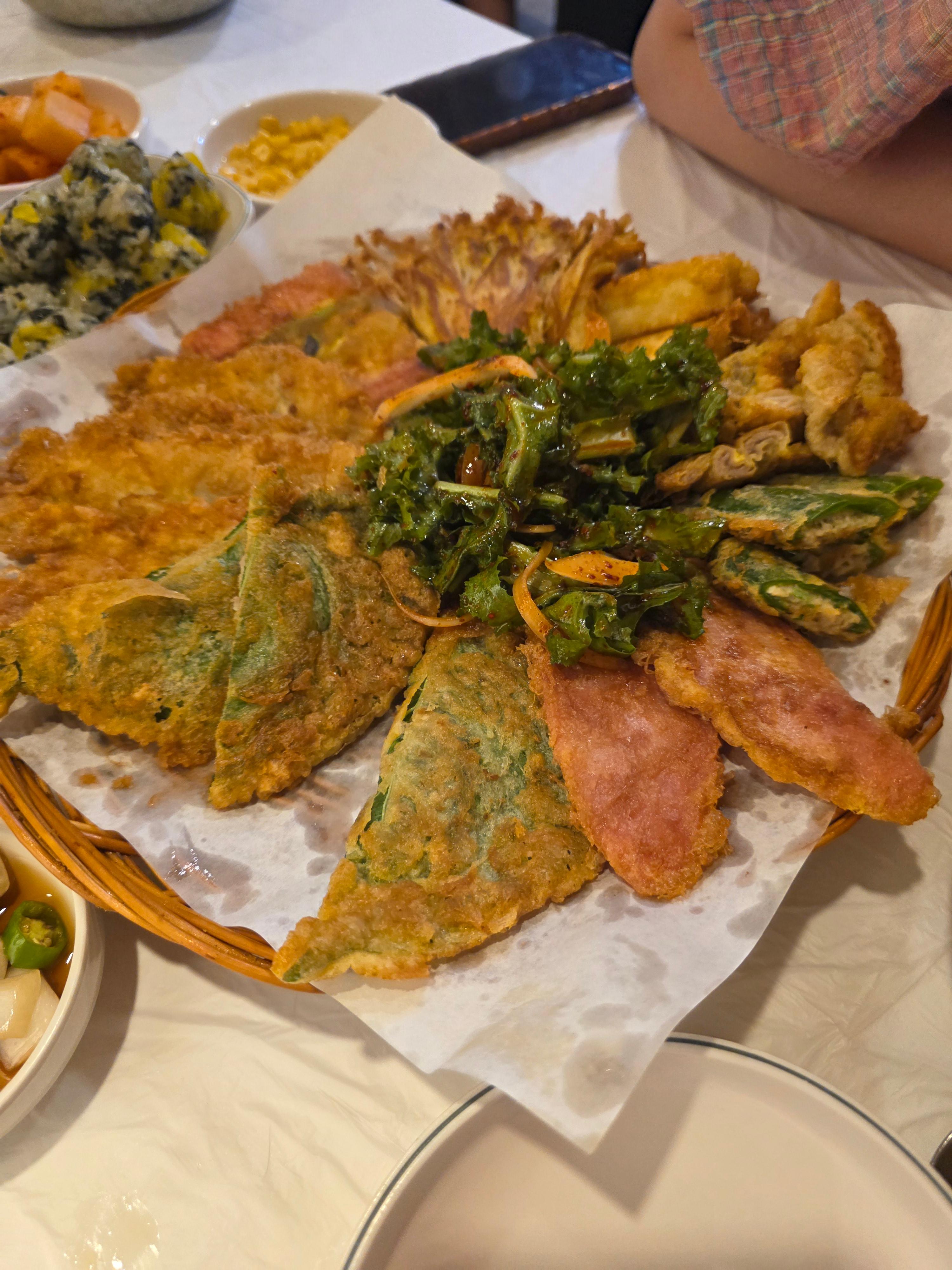 갓 부쳐 나온 전들이 한 접시에 가득 담겨 나오는데, 비주얼부터 완벽 그 자체였어요.