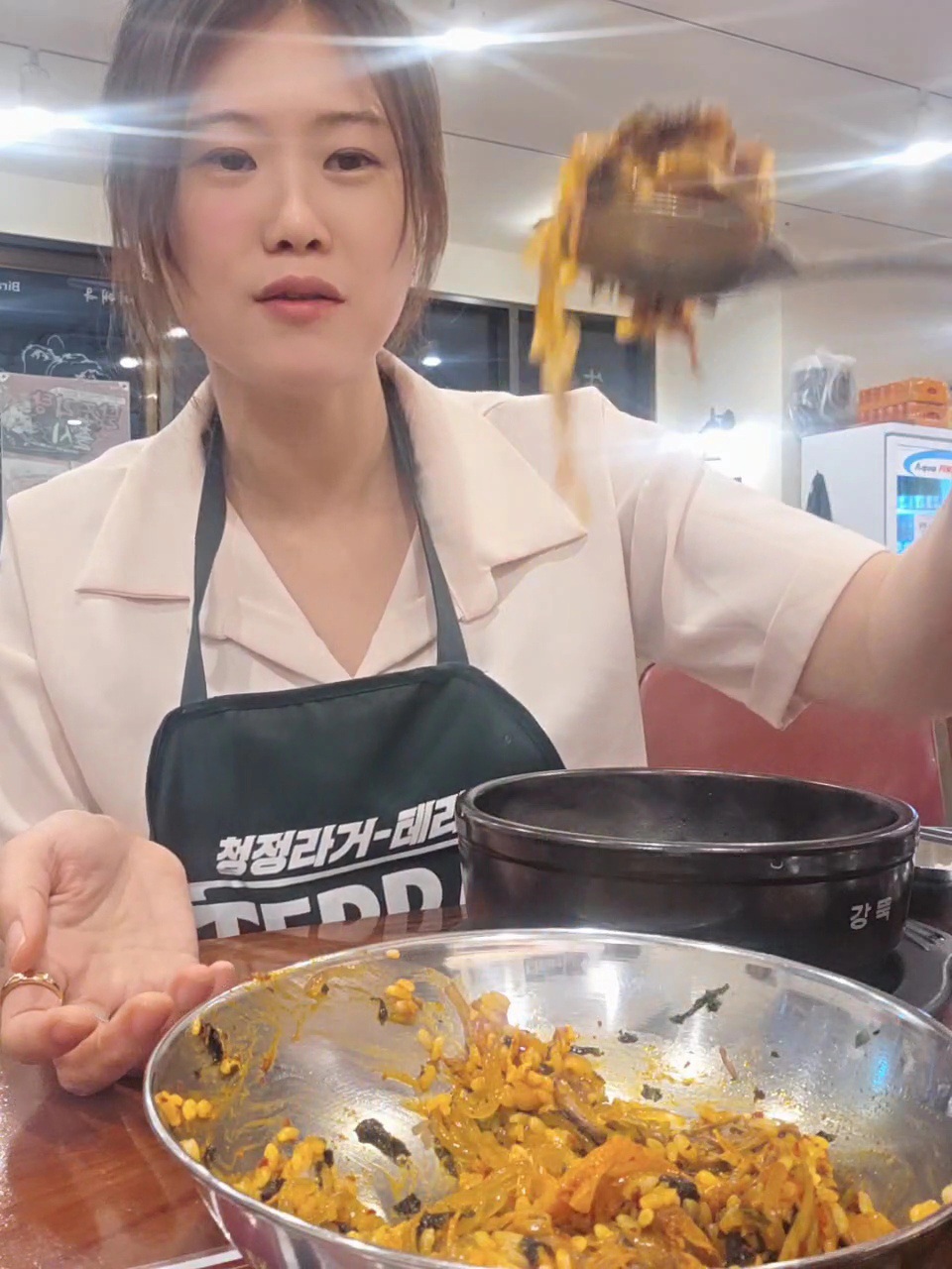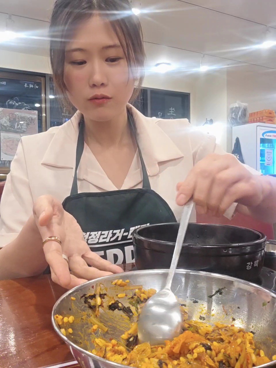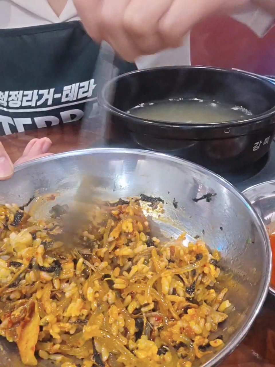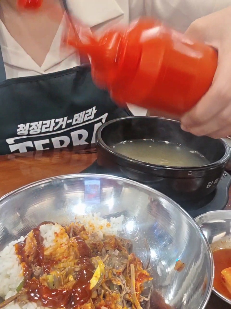 그런데 여기서 끝이 아니에요! 반찬으로 김치, 깍뚜기와 함께 양은 그릇이 나왔는데 처음엔 "이게 뭐지?" 했거든요. 그런데 매장에서 나오는 TV 영상을 보니 비빔밥으로 먹는 방법이 나오더라고요! 완전 획기적이었어요!( 메뉴판에 적혀있는걸 보지 못한 1인!!)