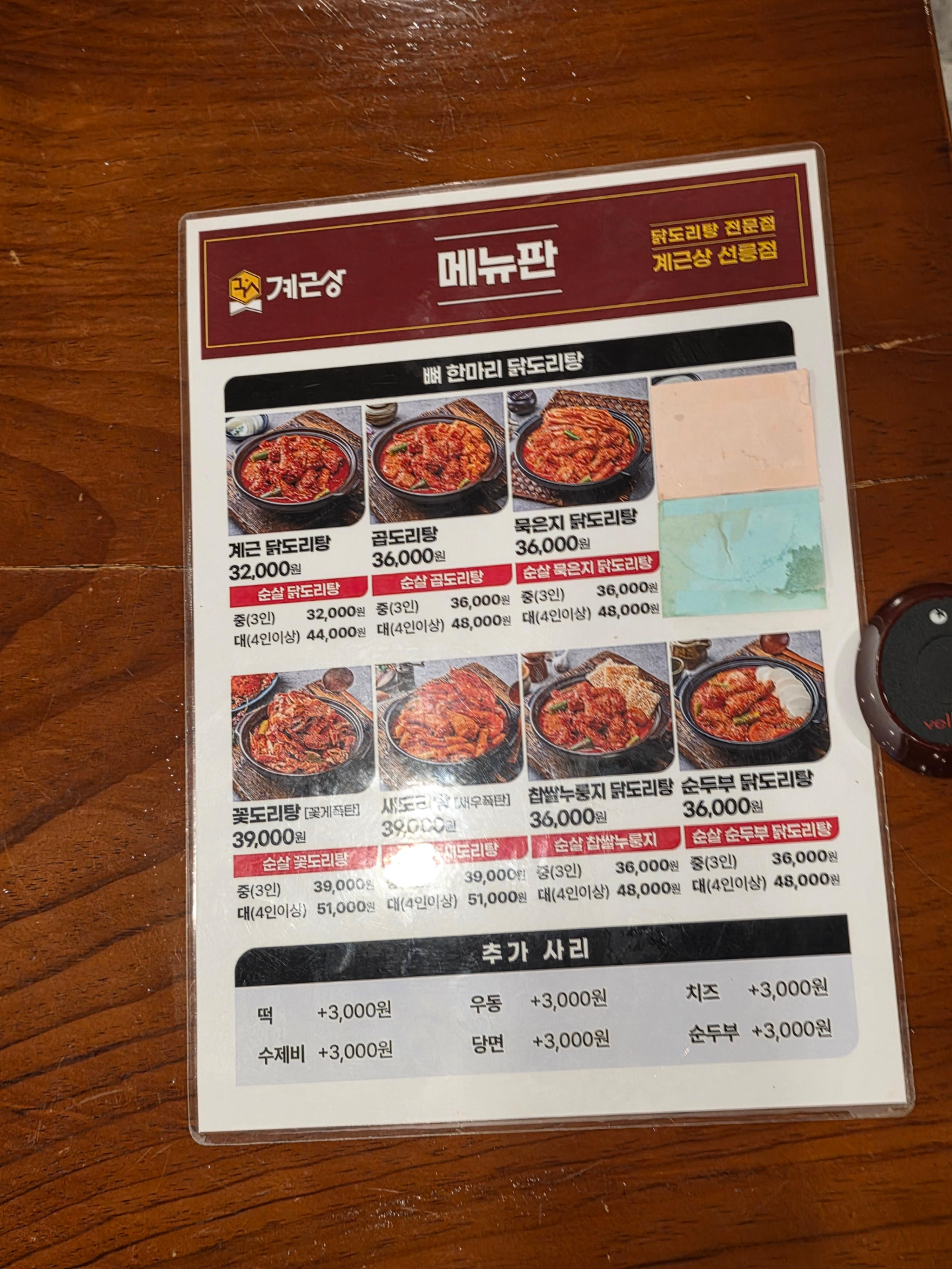 비래옥 대표 메뉴 닭볶탕 메뉴판