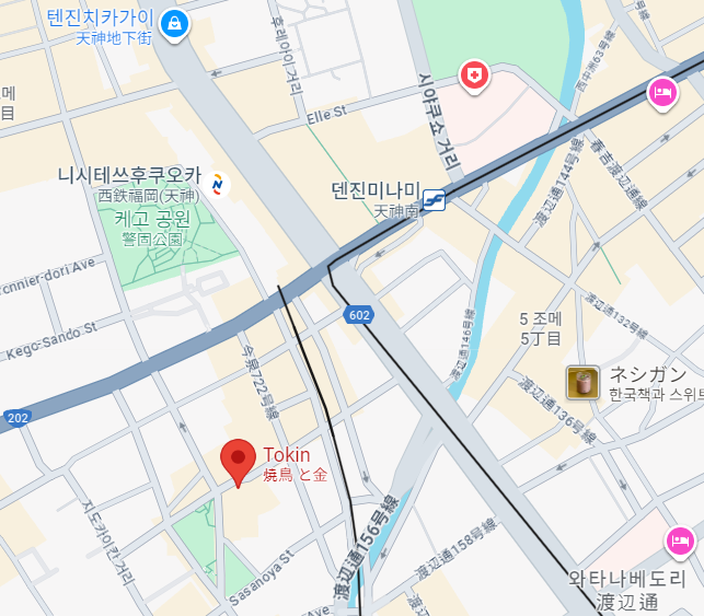야끼토리 토킨은 텐진 번화가에서 가볍게 2차 하러 가기 딱 좋은 위치예요. 나카스강 근처 야경 보고 들르기에도 좋아요. 다만 자리가 많지 않으니 예약을 하거나 조금 일찍 가는 게 좋아 보였습니다.