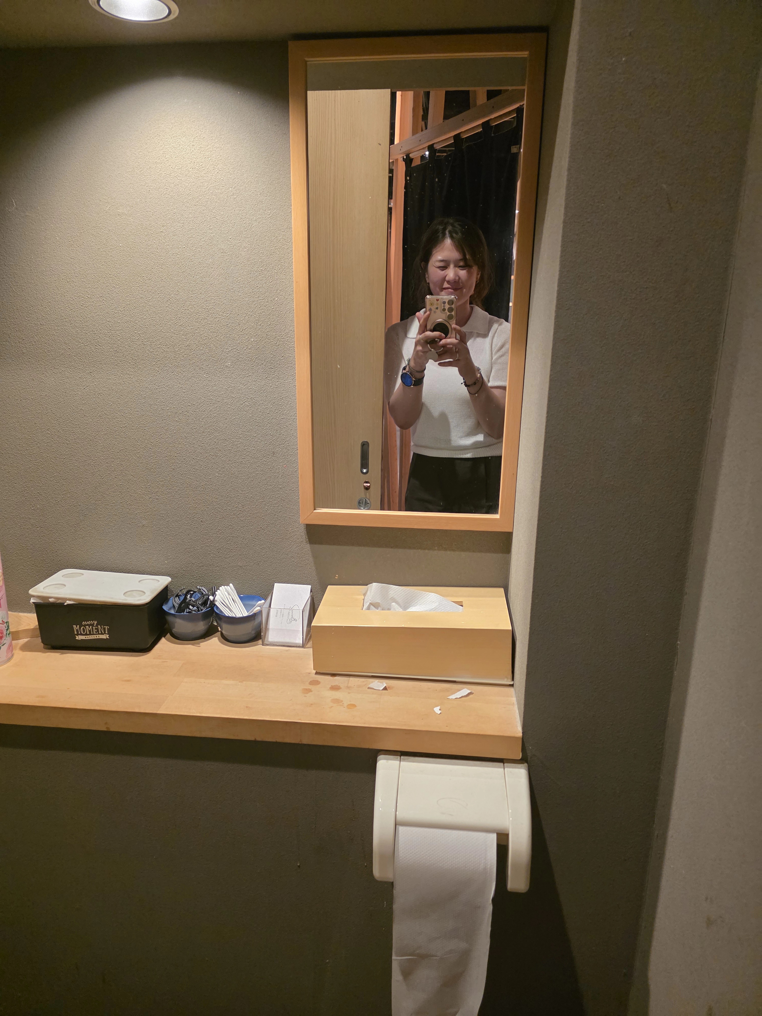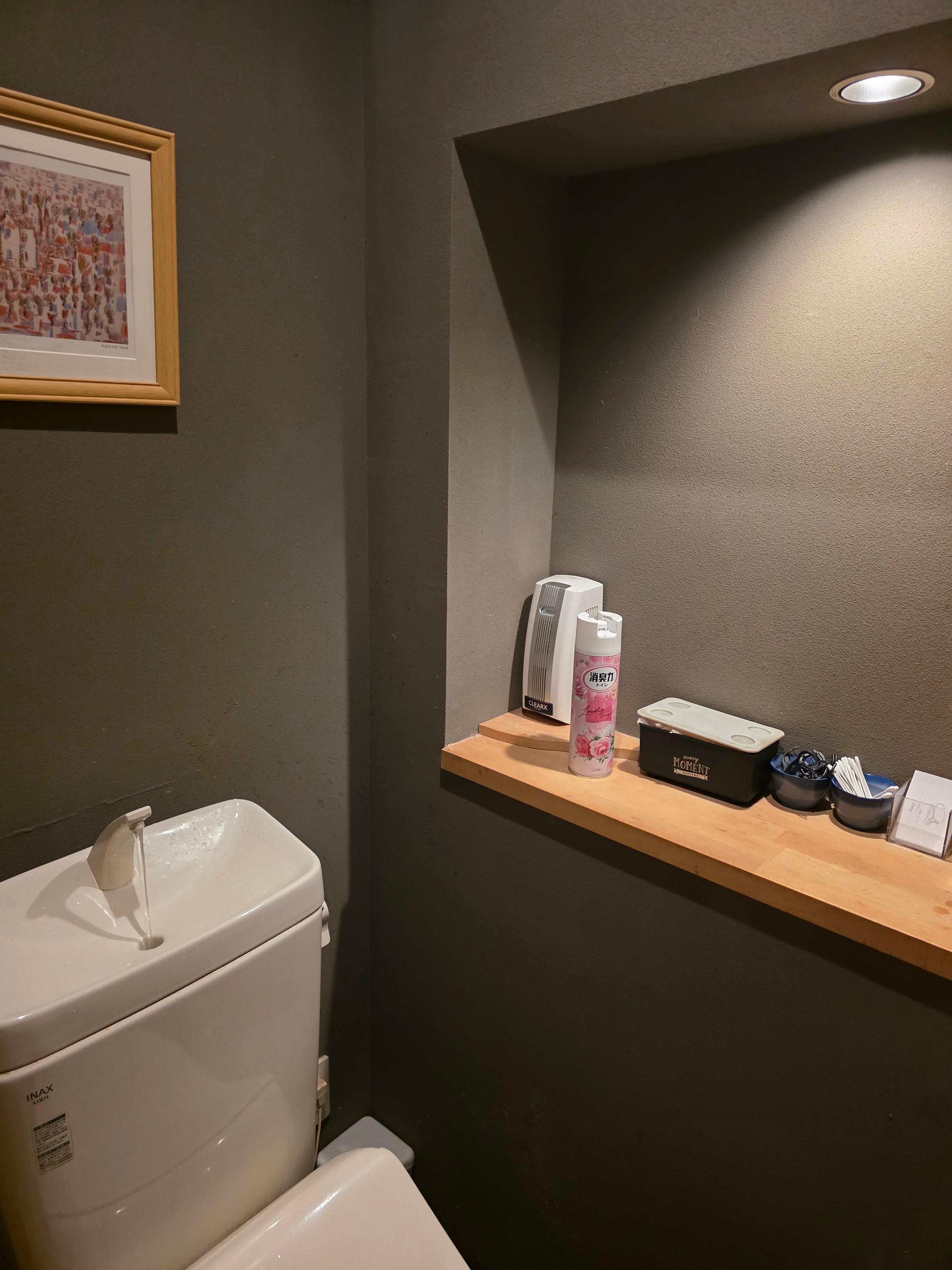 좁은 공간을 알차게 활용한 일본식 화장실 구조가 인상적이었어요. 변기 위에 세면대가 있어 물을 내리면 손 씻는 물이 나오는 시스템, 처음 보면 꽤 신기하실 거예요. 선반에는 방향제, 휴지, 생리용품 등이 깔끔하게 준비돼 있었고, 은은한 조명 덕분에 작지만 아늑한 분위기가 느껴졌어요.