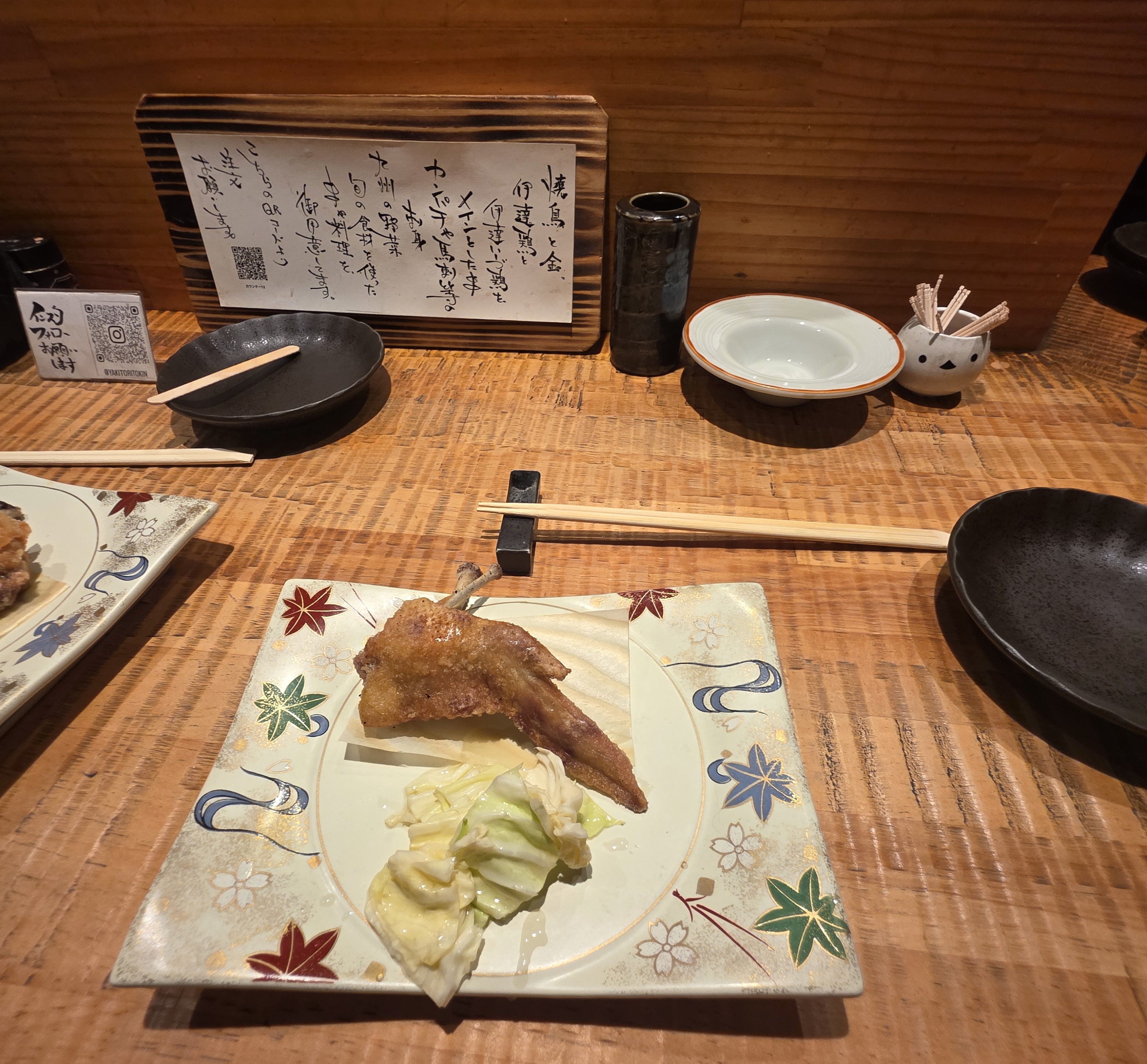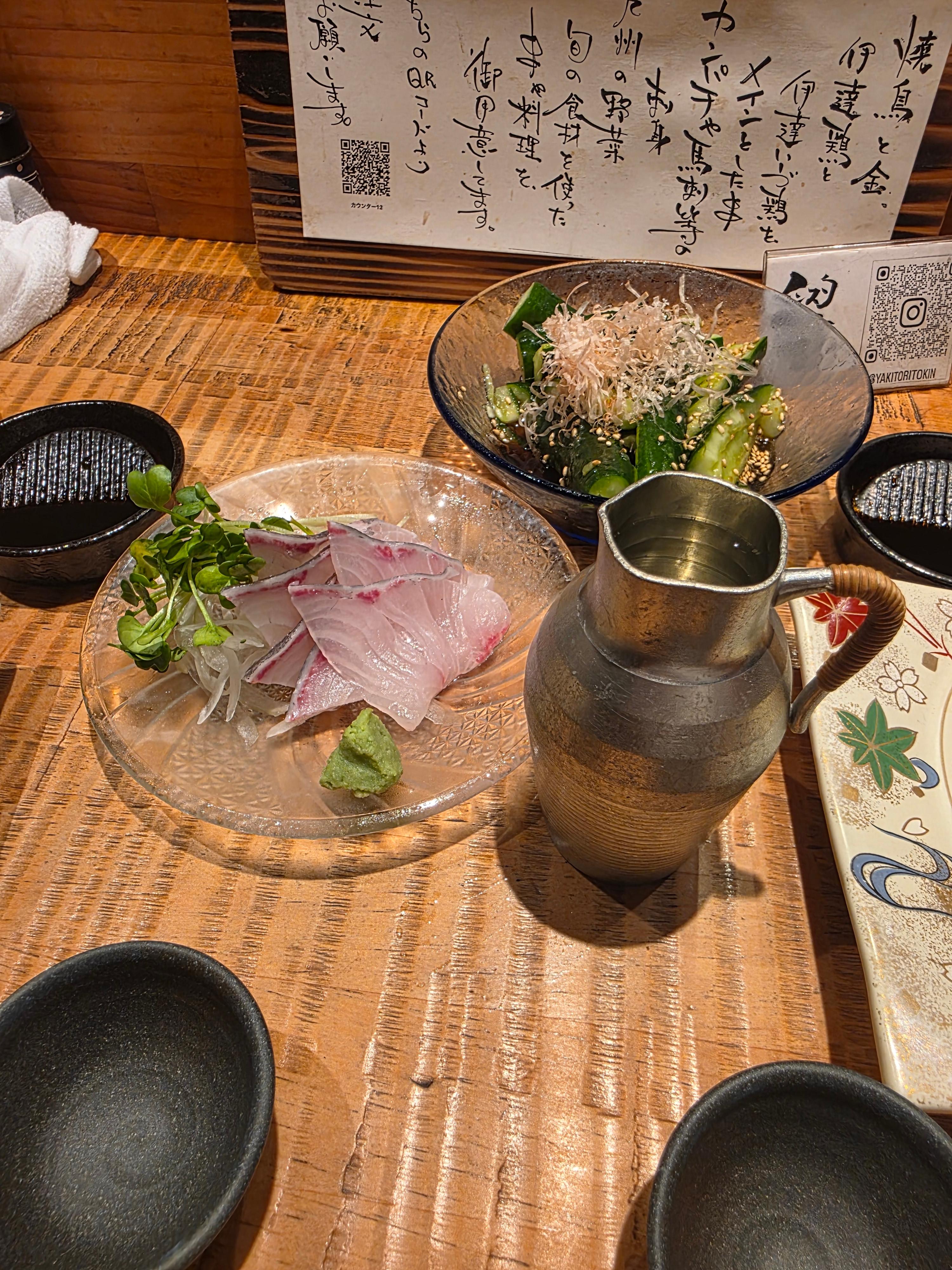 메뉴판에는 닭·돼지·소꼬치, 채소 꼬치, 그리고 사시미와 가벼운 안주류까지 다양하게 있었습니다.