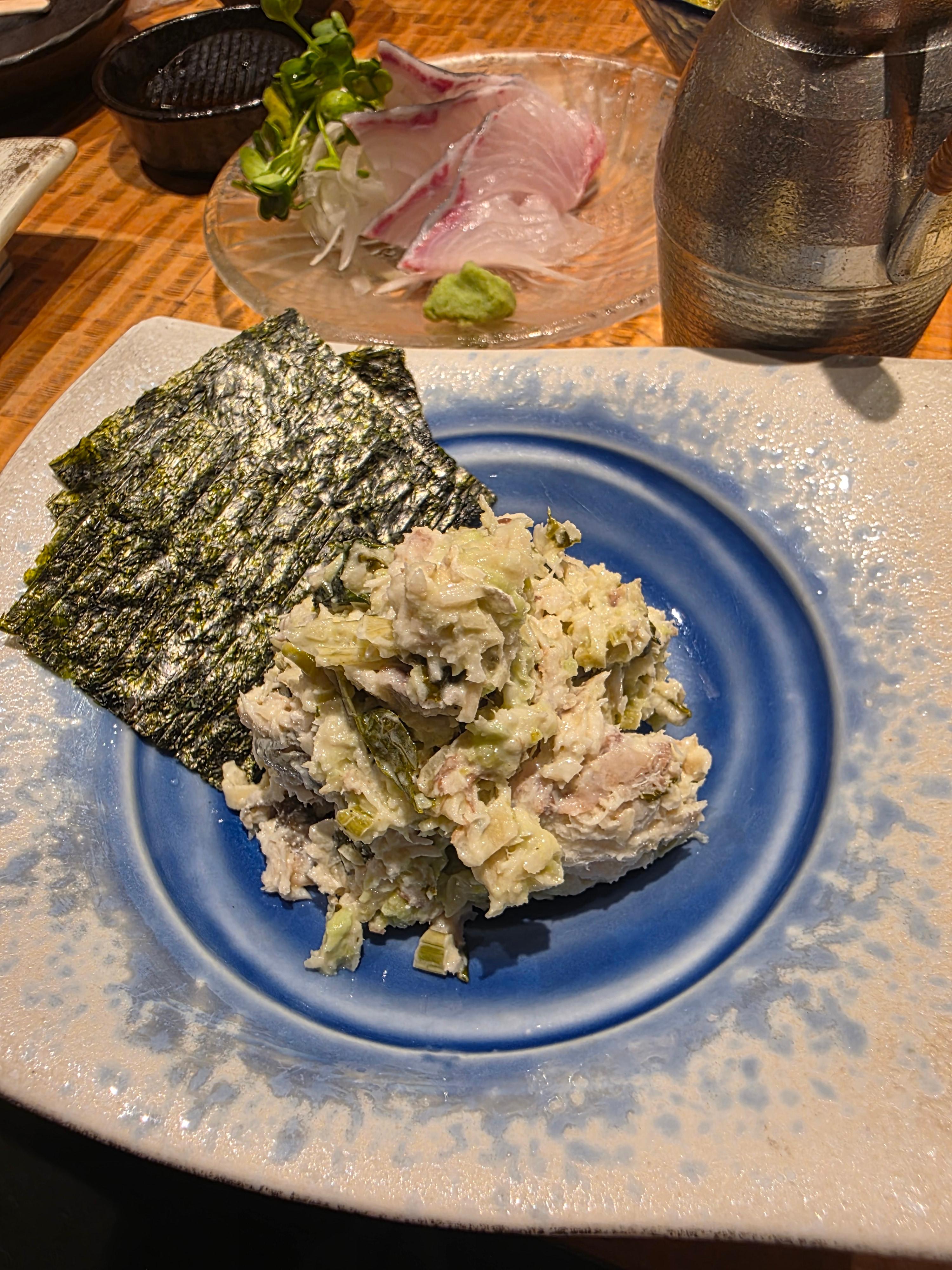 그리고 마요네즈와 참치만 있는건 아니고 와사비잎이 아니였나 생각이들어요. 다른 야채는 아니고 콩맛 비슷하긴 하는데, 아는 맛이예요! 이거 진짜강추예요~!!기본 참치 마요의 친근한 맛에 생와사비의 신선한 향과 매콤함이 더해져, 술과 함께 먹을 때 정말 만족도가 높았던 요리였습니다.특히 사케랑 곁들였을 때 풍미가 확 살아나서, 이 집에서는 꼭 먹어봐야 할 시그니처 안주 중 하나라고 생각해요.