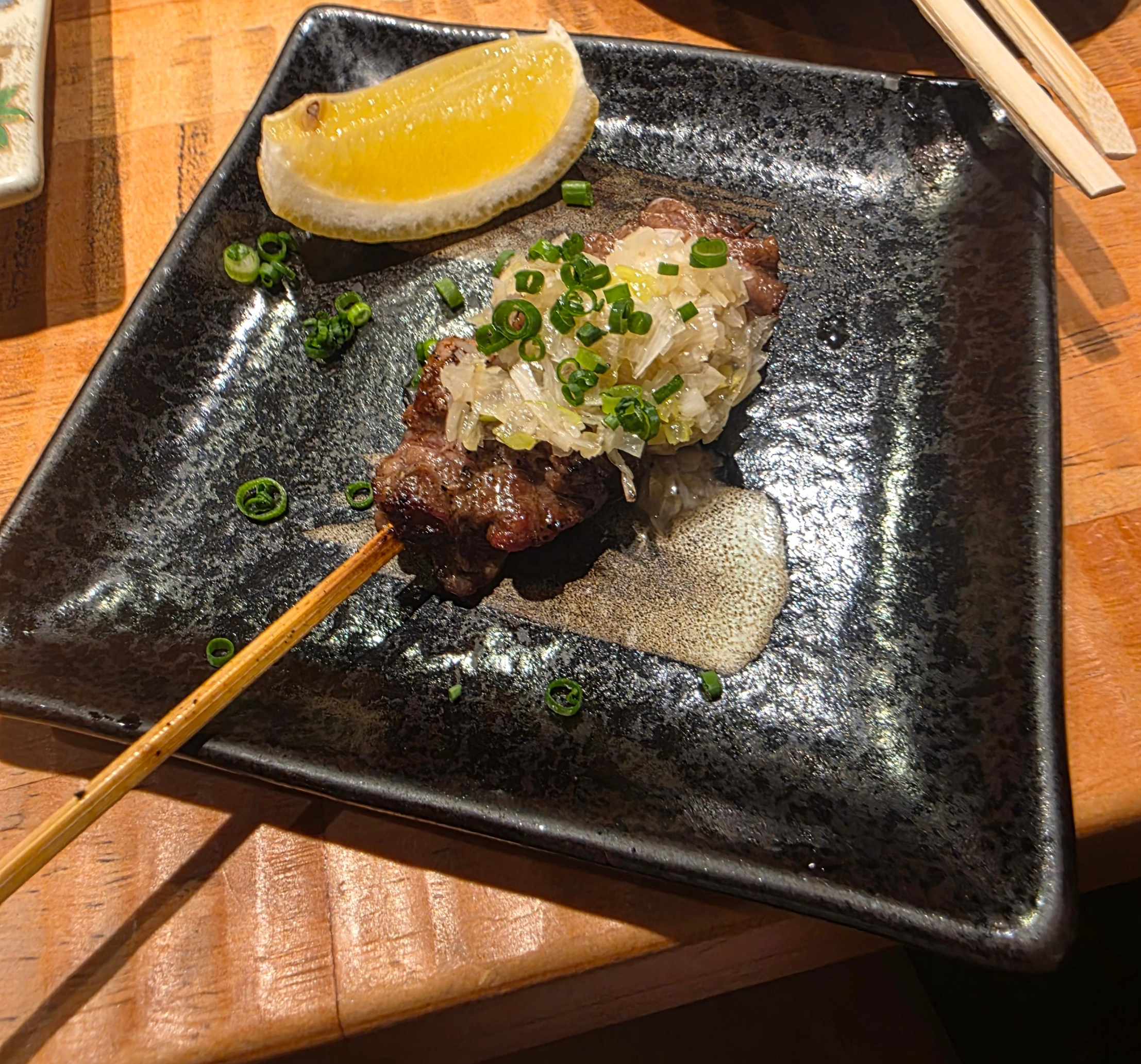얇게 썬 우설을 꼬치에 꽂아 구워내는데, 파의 향과 함께 먹으면 잡내가 줄고 담백하면서도 고소한 맛이 나요. 씹을수록 육즙과 감칠맛이 살아납니다.레몬즙을 살짝 뿌려 먹으면 상큼하게 즐길 수 있어 좋았어요.