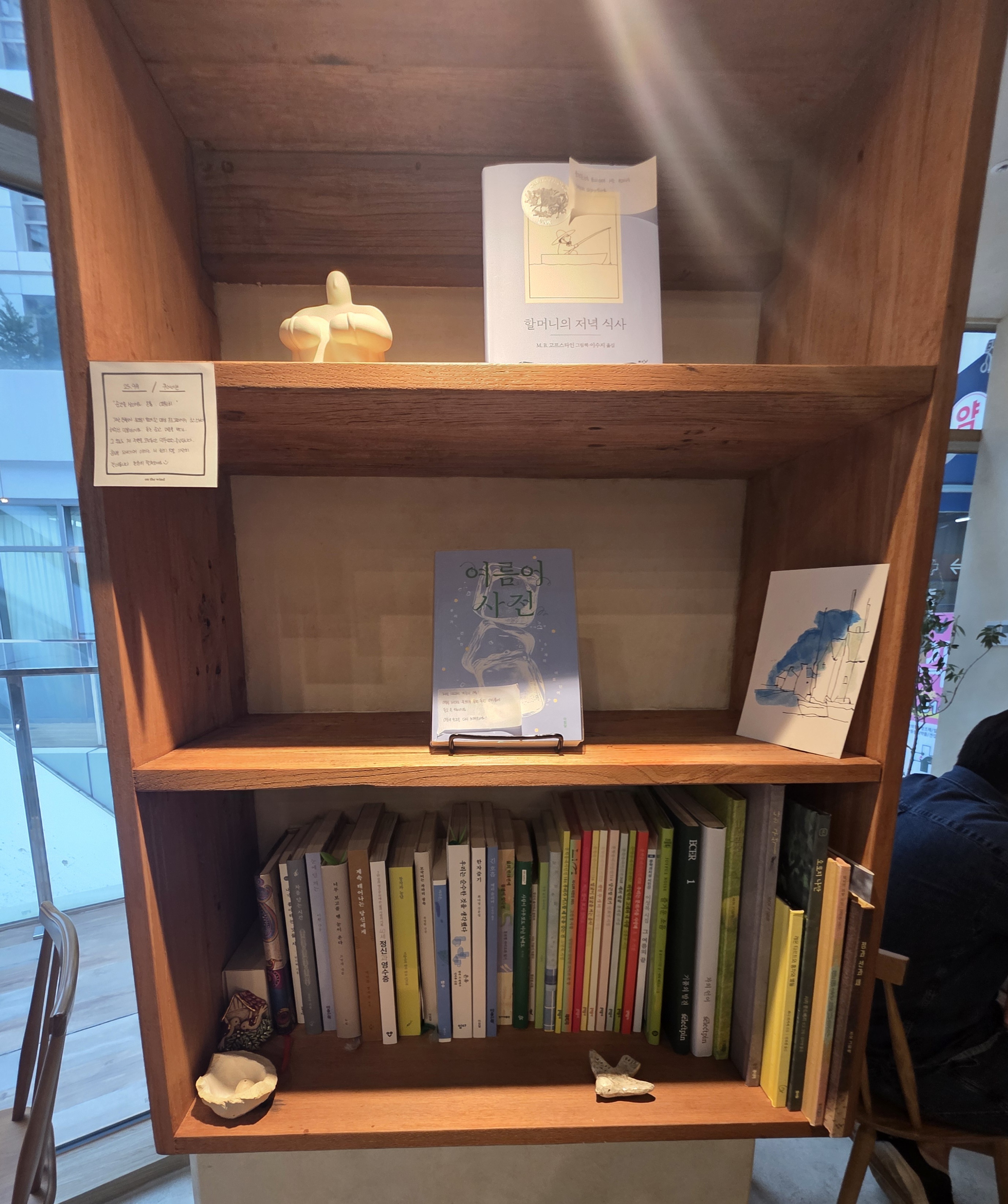특히 눈에 띄는 건 벽면 가득한 책장! 여사장님이 책을 정말 좋아하셔서, 매달 꽂히는 문장과 관련된 책을 직접 큐레이션해서 꽂아둔다고 해요. 그래서 자유롭게 책을 꺼내 읽을 수 있고, 그 자체로 이곳만의 색깔이 확실하게 느껴집니다.책을 좋아하는 사람이라면, 이 감성에 절대 빠져나오기 힘들 거예요.