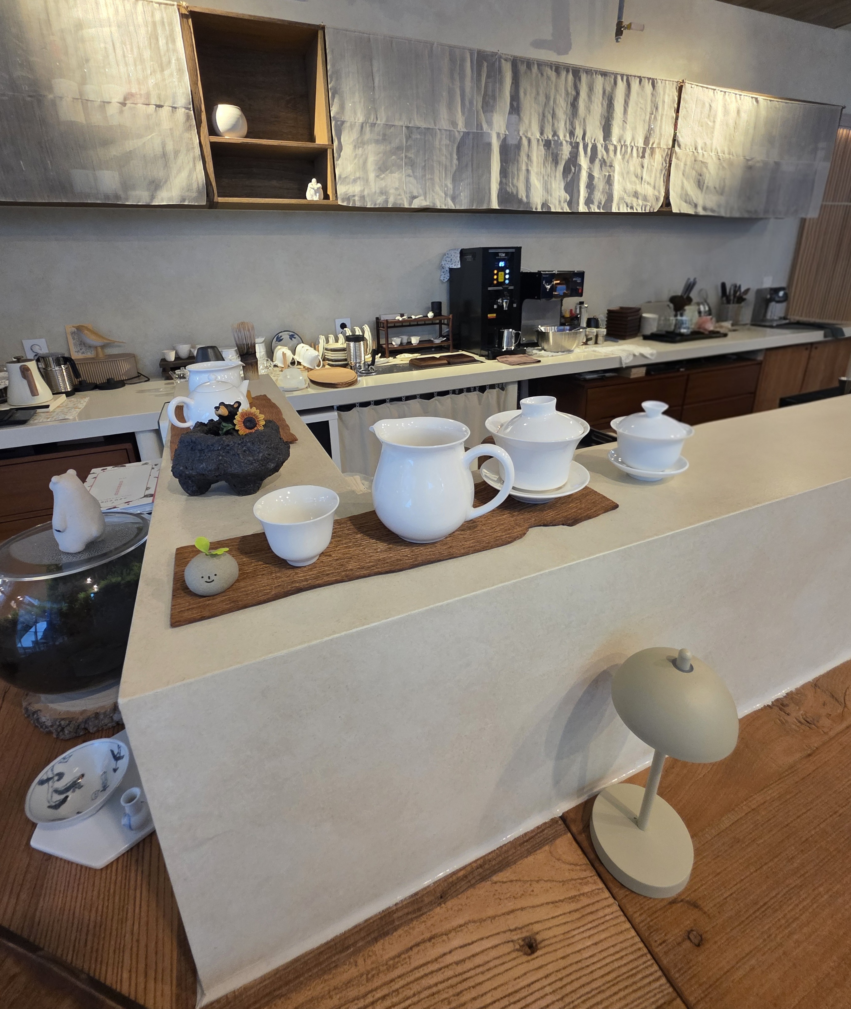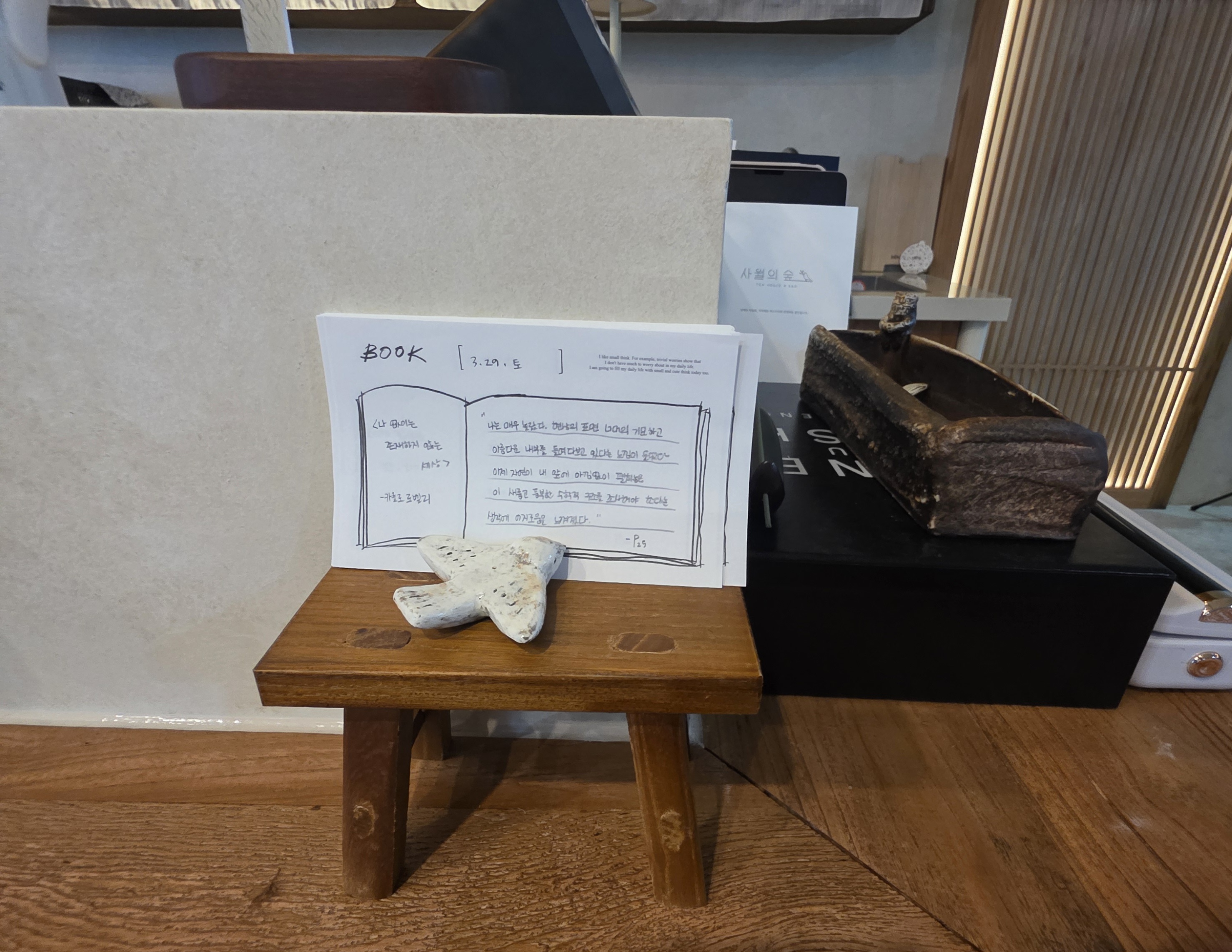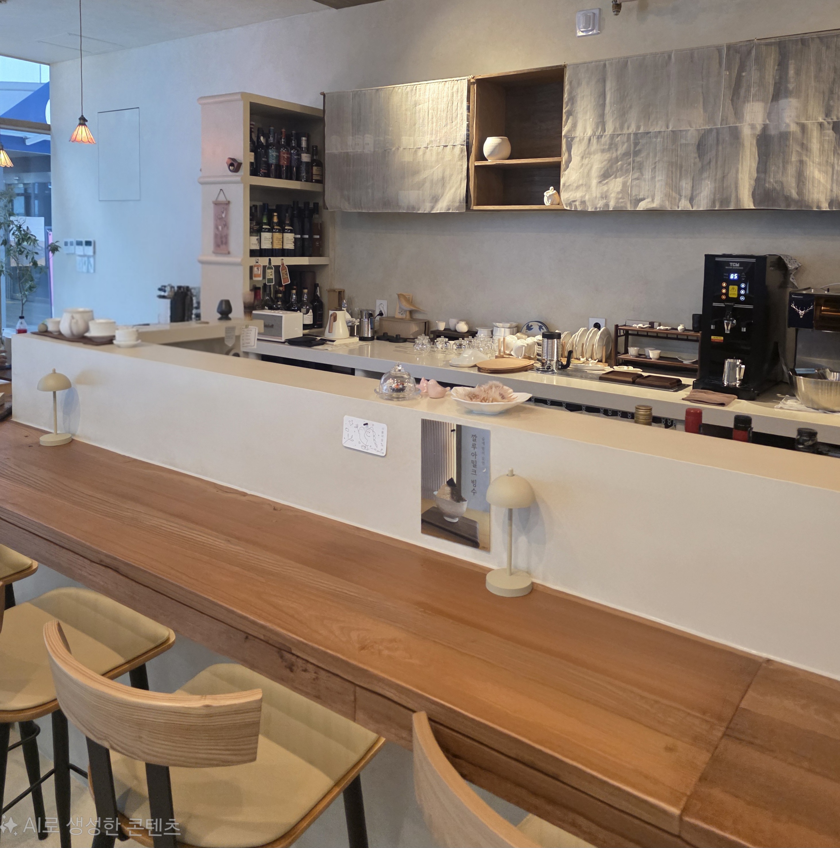 처음 들어서자마자 느껴진 건 우드톤 인테리어와 따뜻한 조명이 주는 포근함이었어요. 낮에는 아늑한 티하우스 느낌이 강하고, 저녁 시간이 되면 은은한 조명이 켜지면서 분위기가 한층 차분하고 세련된 바로 바뀝니다.