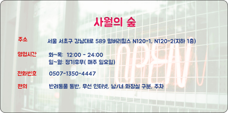 - 주소: 서울 서초구 강남대로 589 멀버리힐스 N120-1, N120-2 (지하 1층)