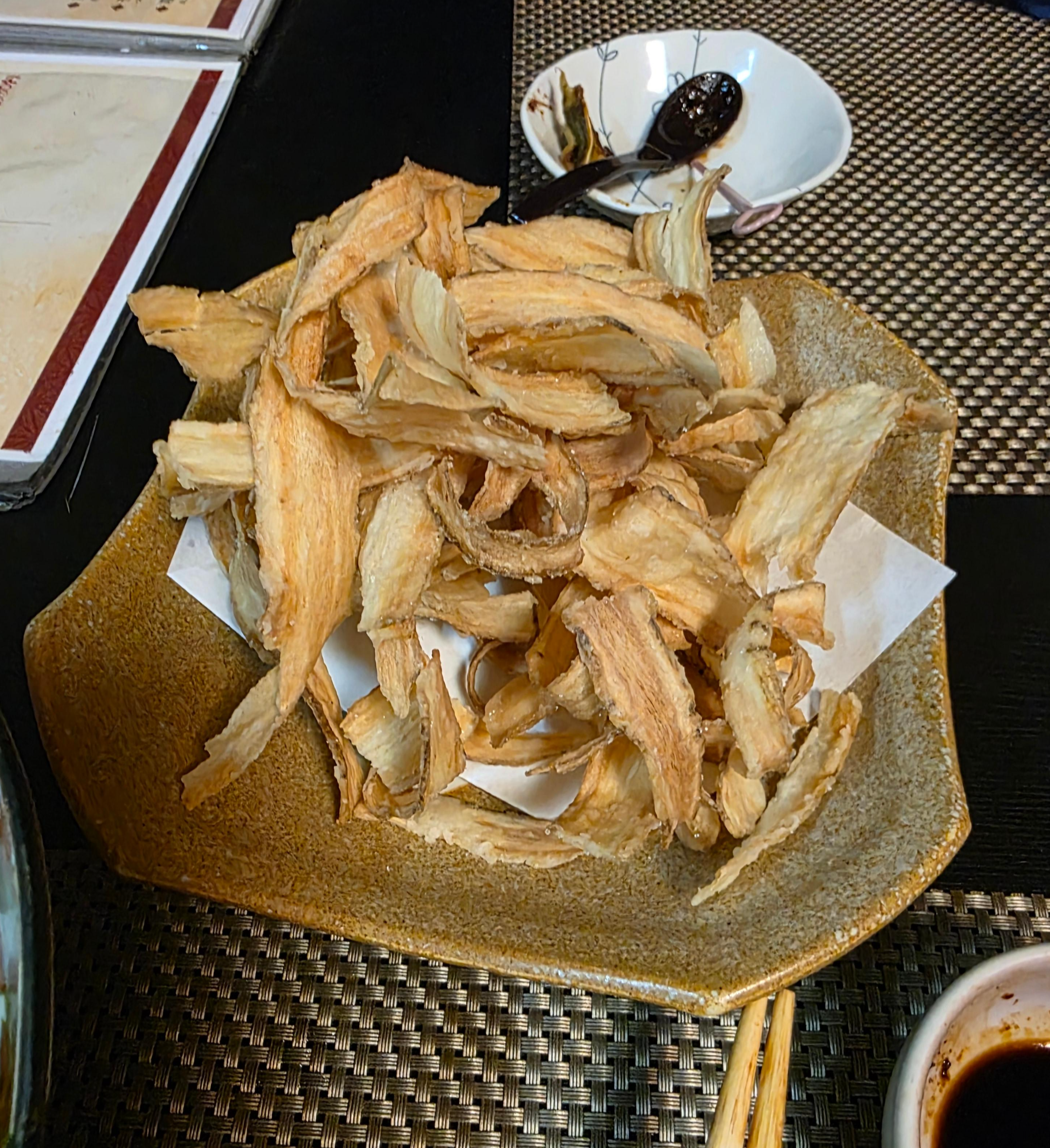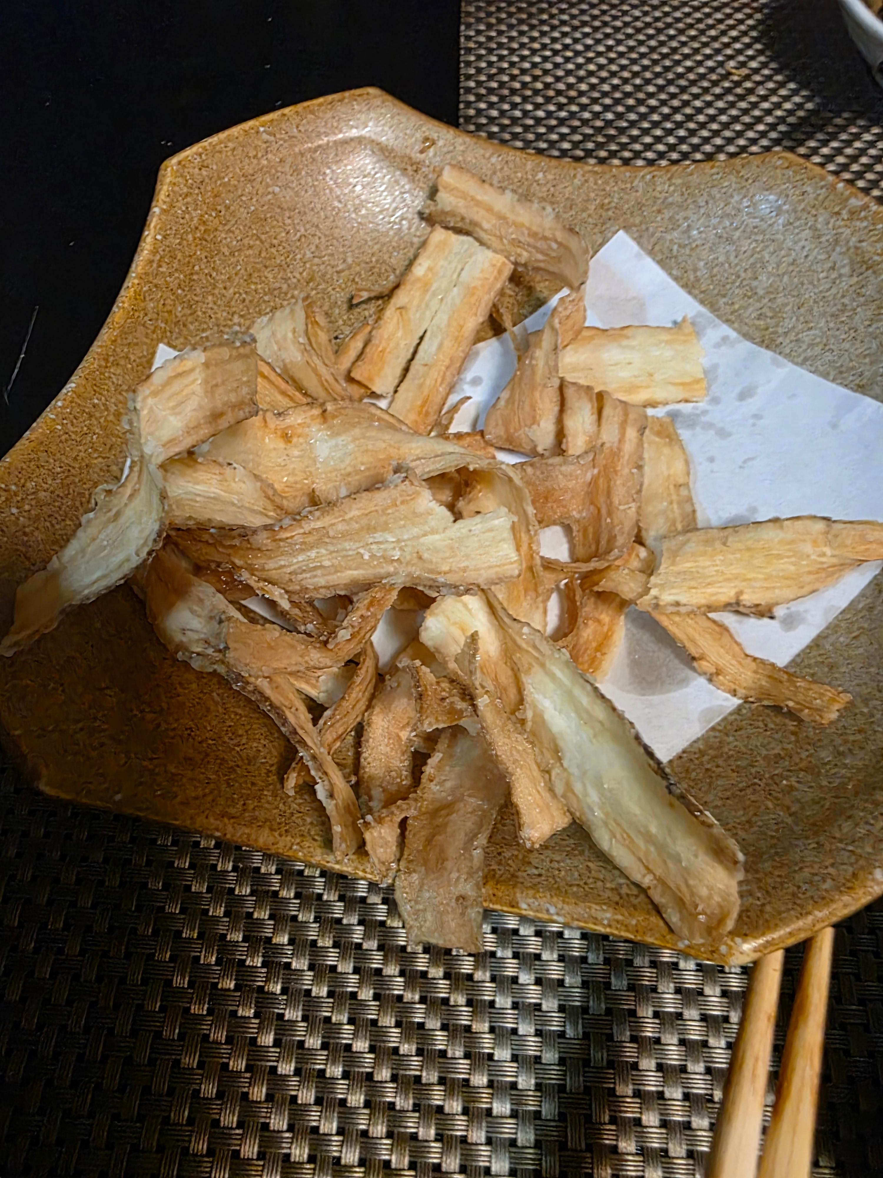 이날 저녁의 원픽 메뉴였어요! 얇게 썬 우엉을 바삭하게 튀겨낸거였는데요. 진짜 아무것도 하지 않은 자연의맛이었는데,첫 입에 ‘와!’ 소리가 절로 나올 만큼 고소했어요.