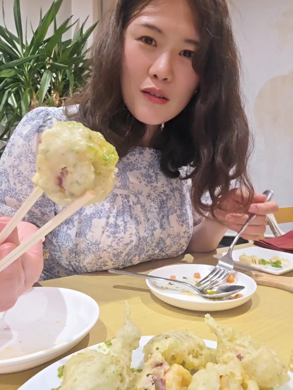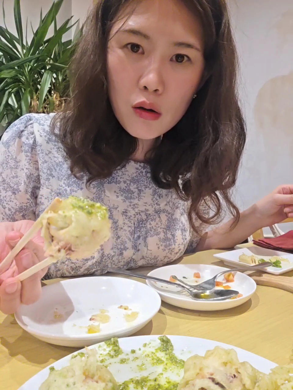 저는 먹으면서 살짝 김부각 같은 느낌도 받았어요. 옆에 나온 초록빛 소스는 처음엔 바질 페스토인 줄 알았는데, 사실은 아오노리 페스토라서 허브 향과 파래 특유의 향이 섞여 독특하면서도 청량했답니다.