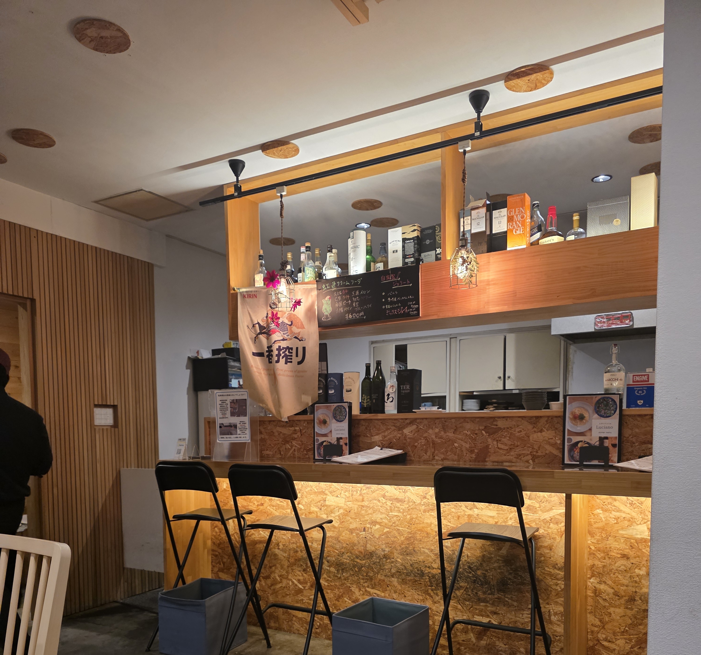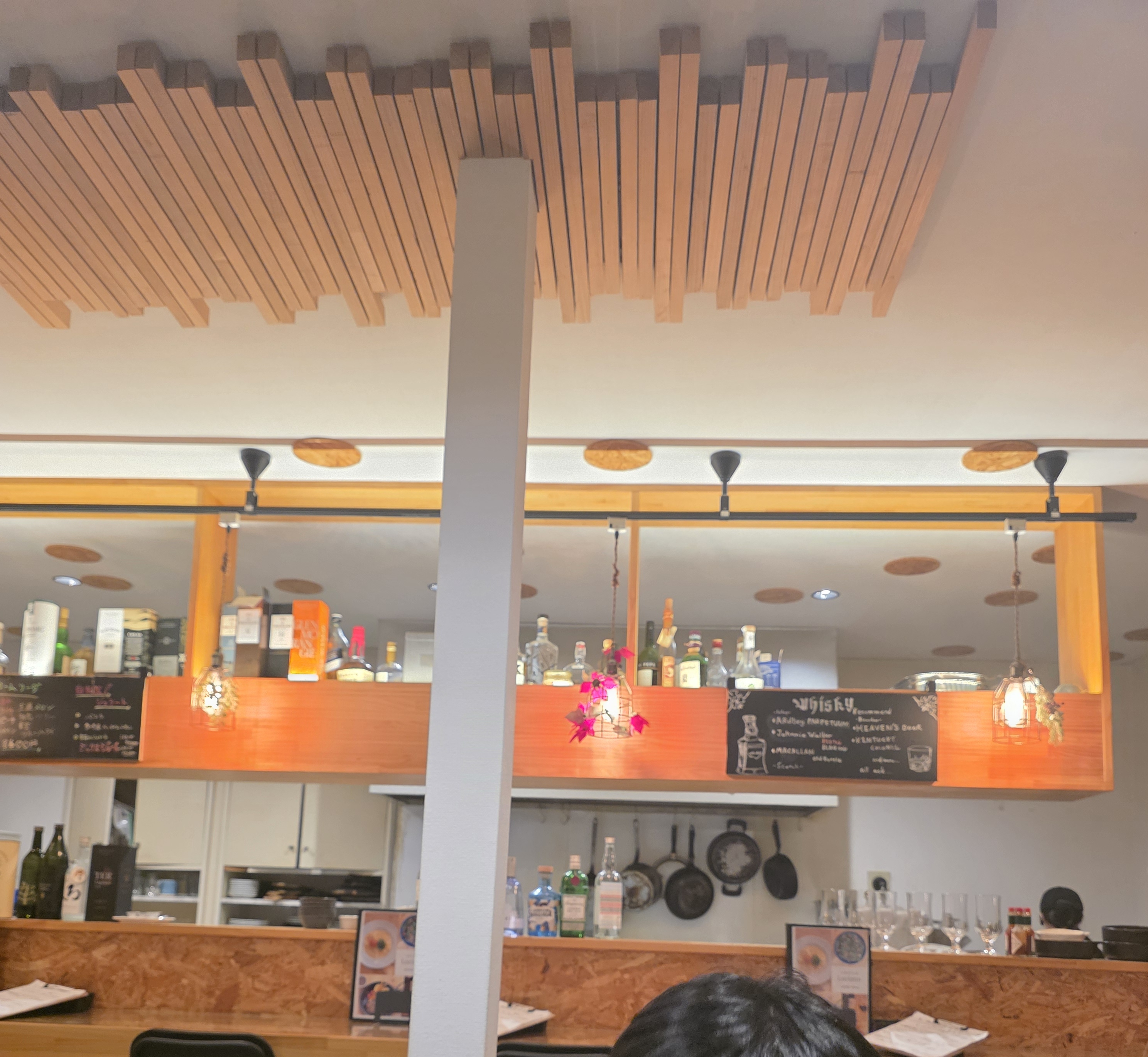 실내로 들어가면 나무 톤의 인테리어가 주는 아늑함이 좋았습니다. 오픈형 주방에 와인과 위스키가 진열된 바 공간, 그리고 심플한 테이블 배치까지… 깔끔하면서도 감각적인 분위기였어요. 여행지에서 들르기에 부담 없고, 현지인들도 즐겨 찾는 느낌이 강하게 났습니다.