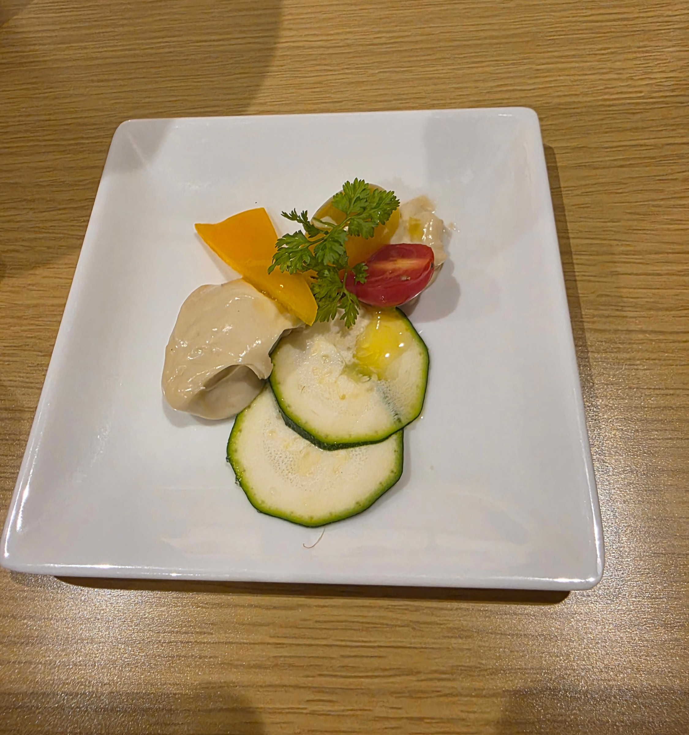 기본 안주(오토오시, お通し)로 작은 플레이트가 나왔어요. 얇게 썬 주키니랑 방울토마토, 노란 파프리카에 허브가 곁들여져 있고 옆에는 크리미한 두유 치즈 무스 같은 딥이 함께 나왔는데, 은근히 와인 안주로 딱이더라구요. 가볍지만 신선하고, 입맛을 돋구어주 는 느낌이라 시작부터 기분이 좋아졌습니다.