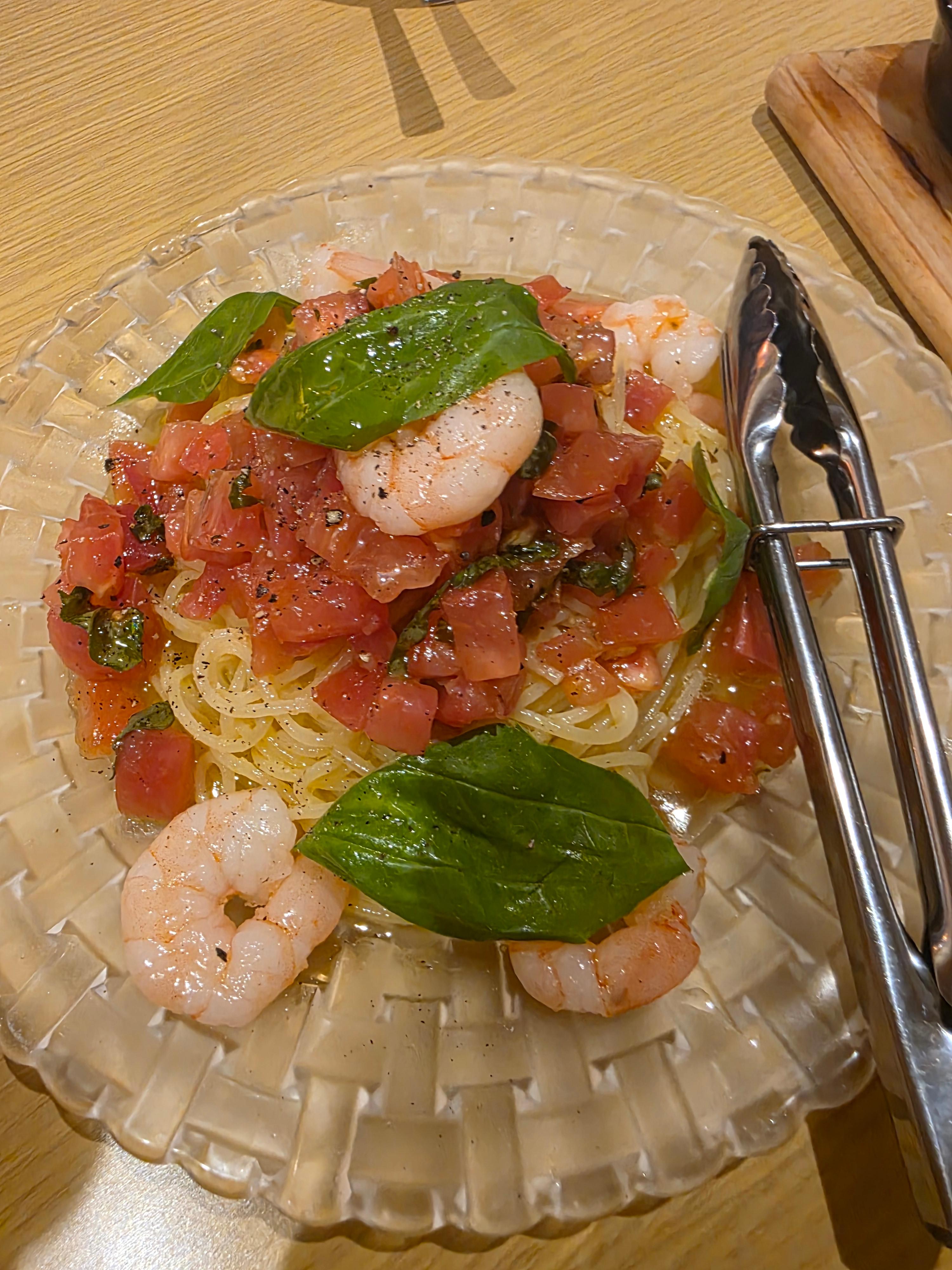 프레쉬 토마토 & 바질, 새우가 들어간 냉파스타(フレッシュトマトとバジル、小エビの冷製パスタ )