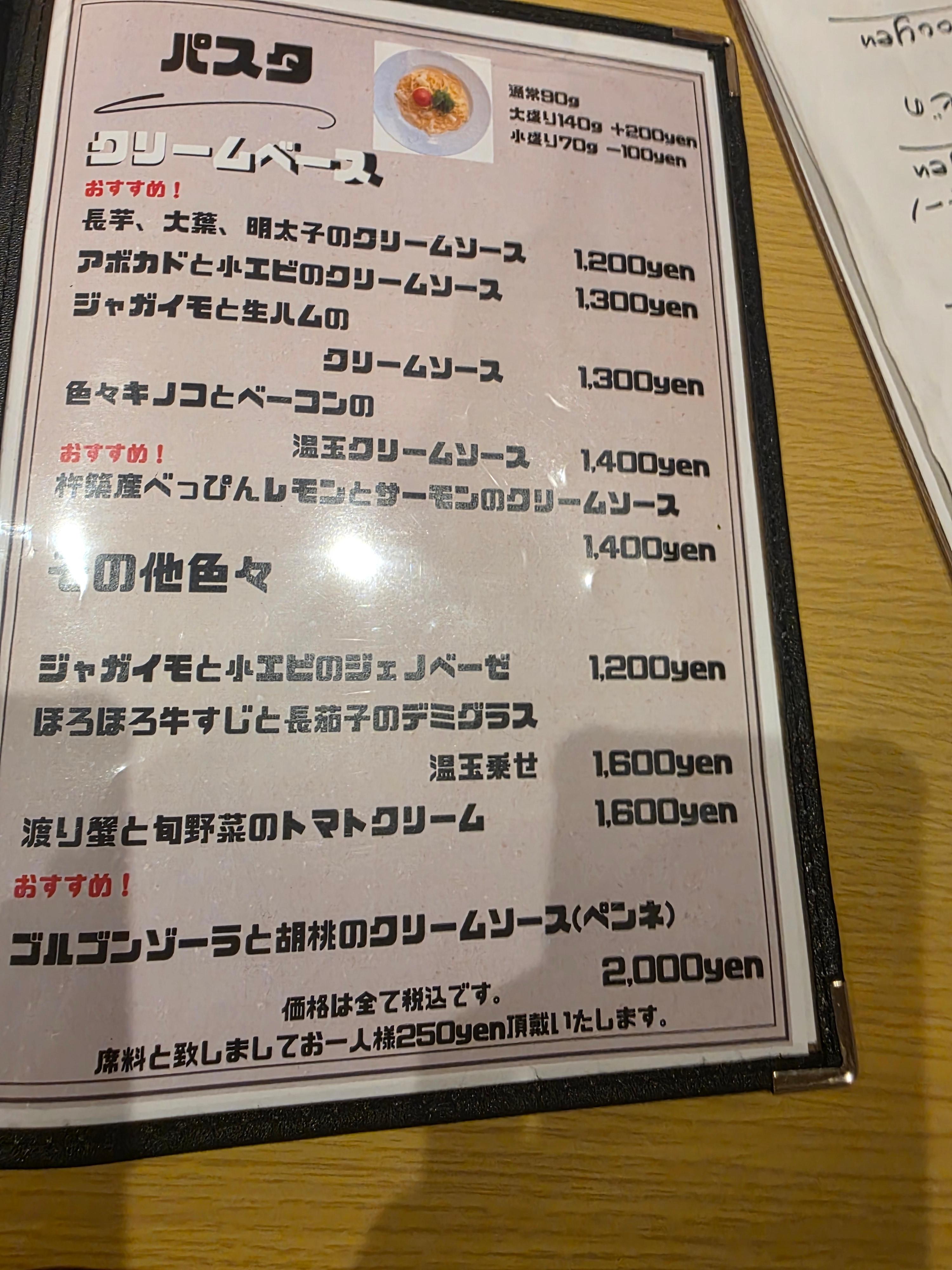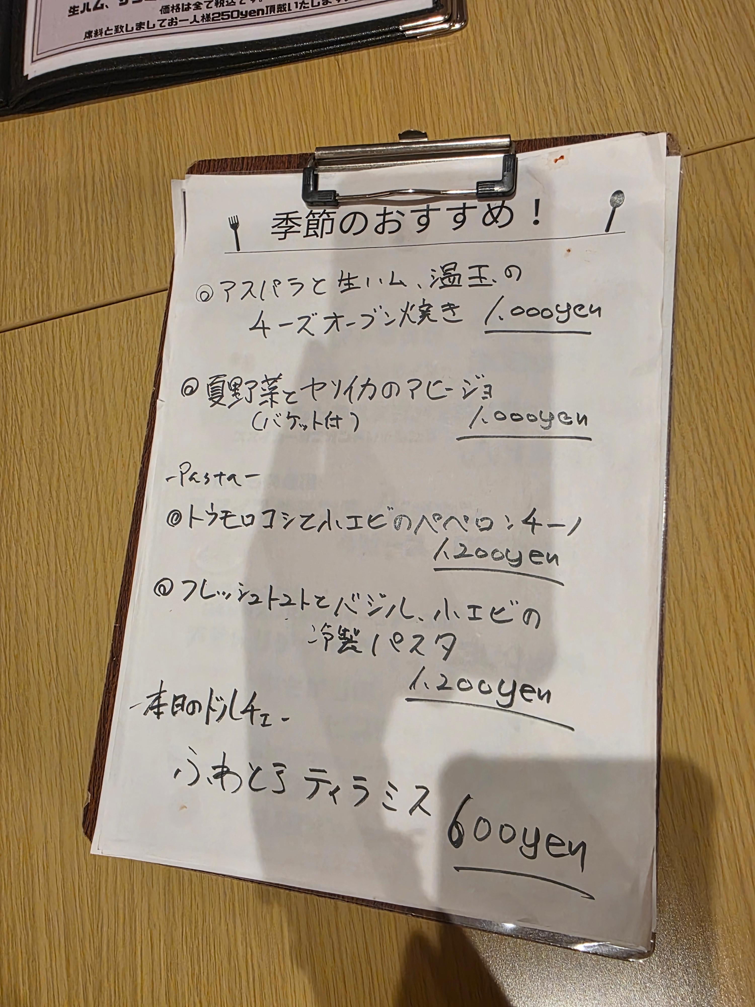 - フレッシュトマトとバジル、小エビの冷製パスタ 1200円 → 프레쉬 토마토 & 바질, 새우가 들어간 냉製 파스타 – 1200엔