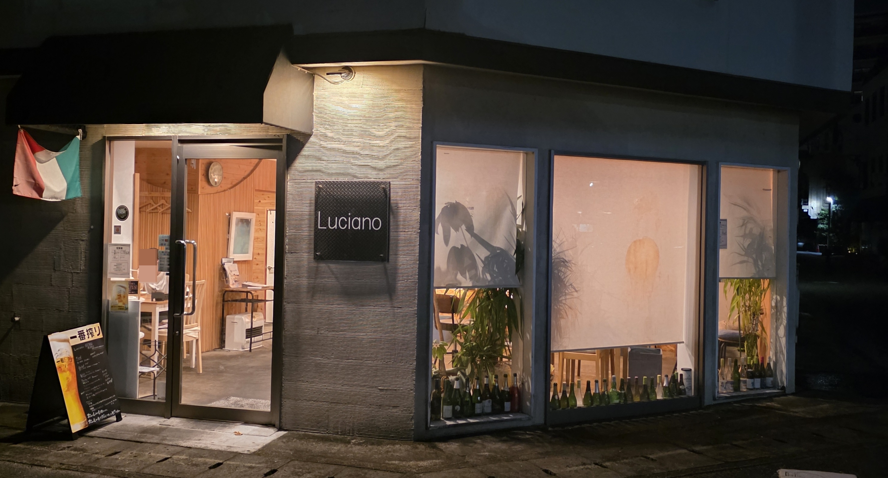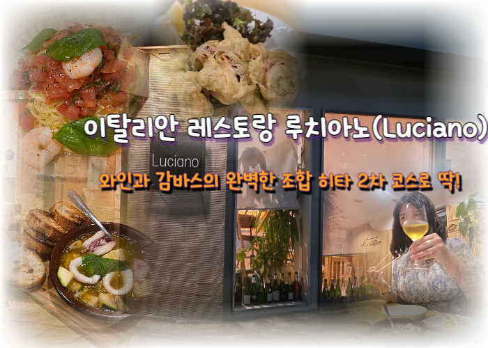 블랙 톤의 간판에 ‘Luciano’라는 글자가 깔끔하게 빛나고, 창가에는 와인병이 줄지어 놓여 있어서 보는 순간 “여기 와인 맛집이구나!”라는 느낌이 팍 오더라구요.