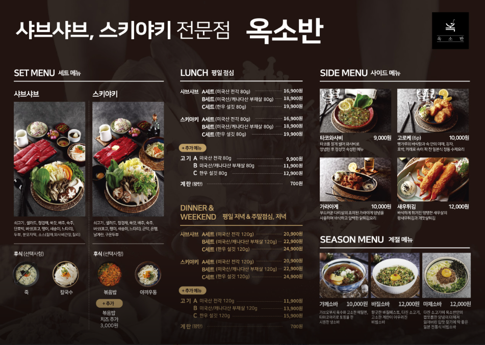 오소반 메뉴판은 샤브샤브 스키야키 두종류가 메인이고 런치와저녁의 가격이다른데 참고해주세요^^*
