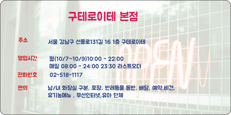 - 주소: 서울 강남구 선릉로131길 16, 1층 구테로이테