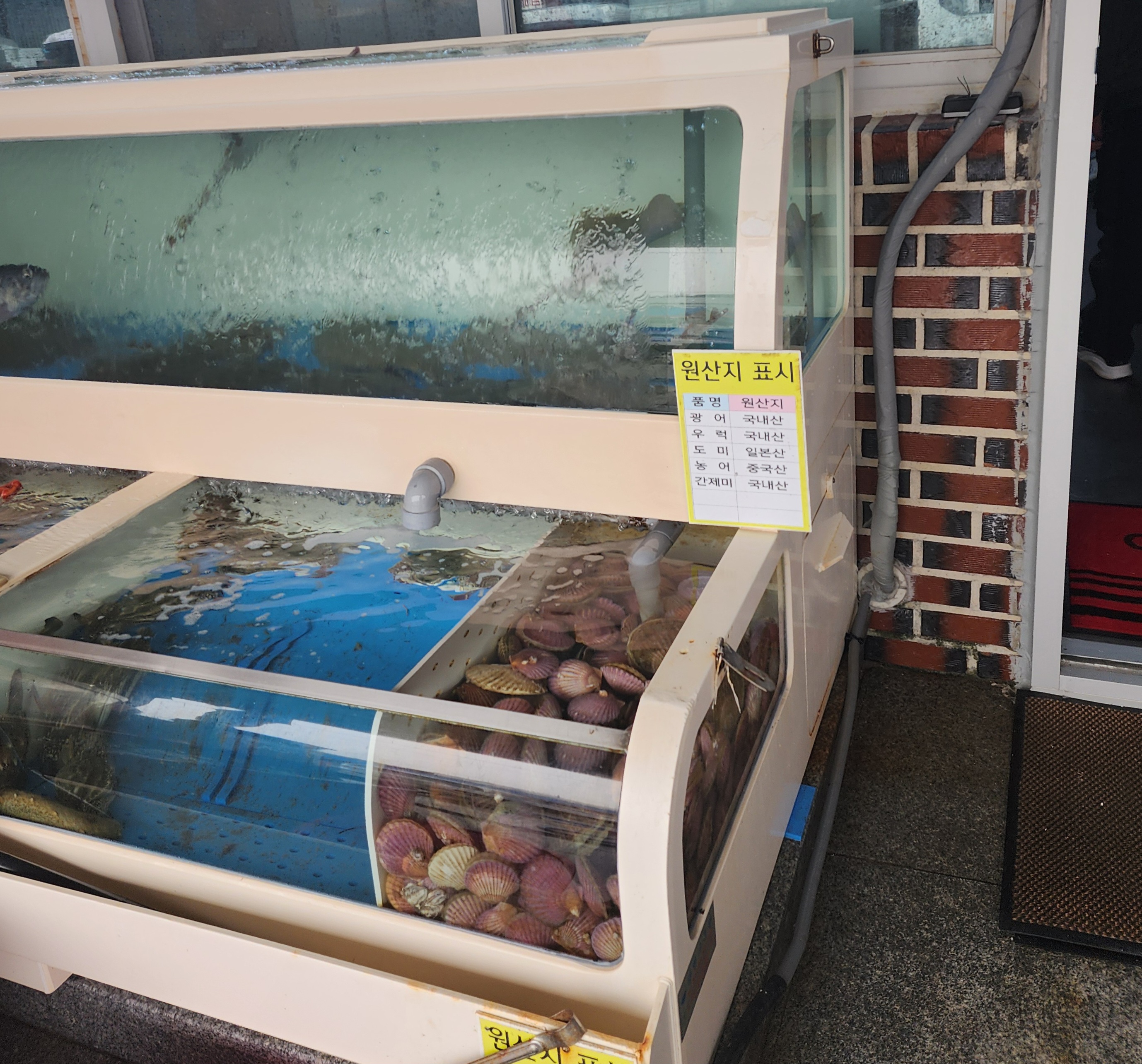 가게 입구부터 ‘바다의 싱싱함’이 확 느껴졌어요. 수조 안에는 광어, 우럭, 도다리, 그리고 이 집의 주인공 키조개가 가득 담겨 있었어요.