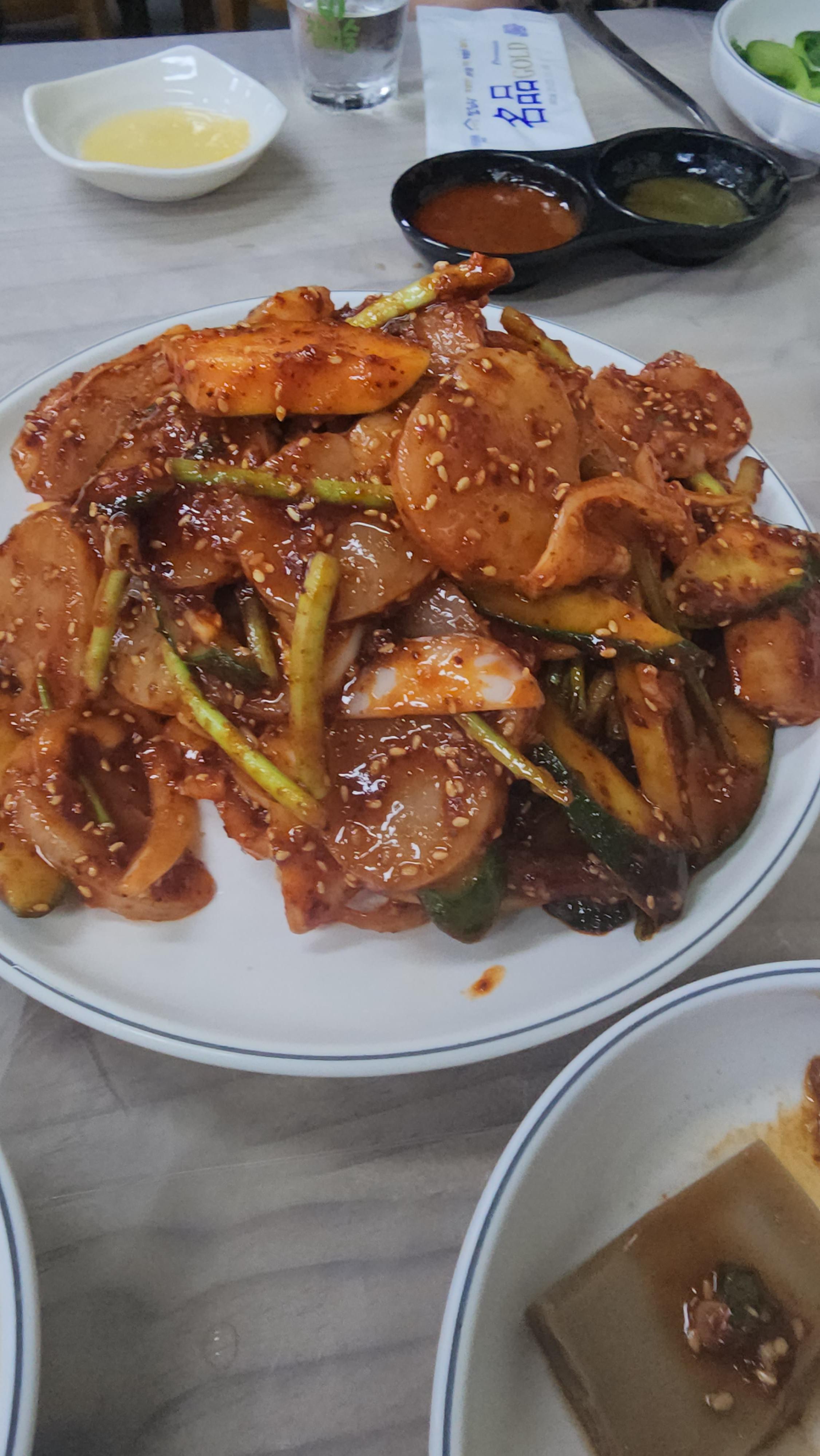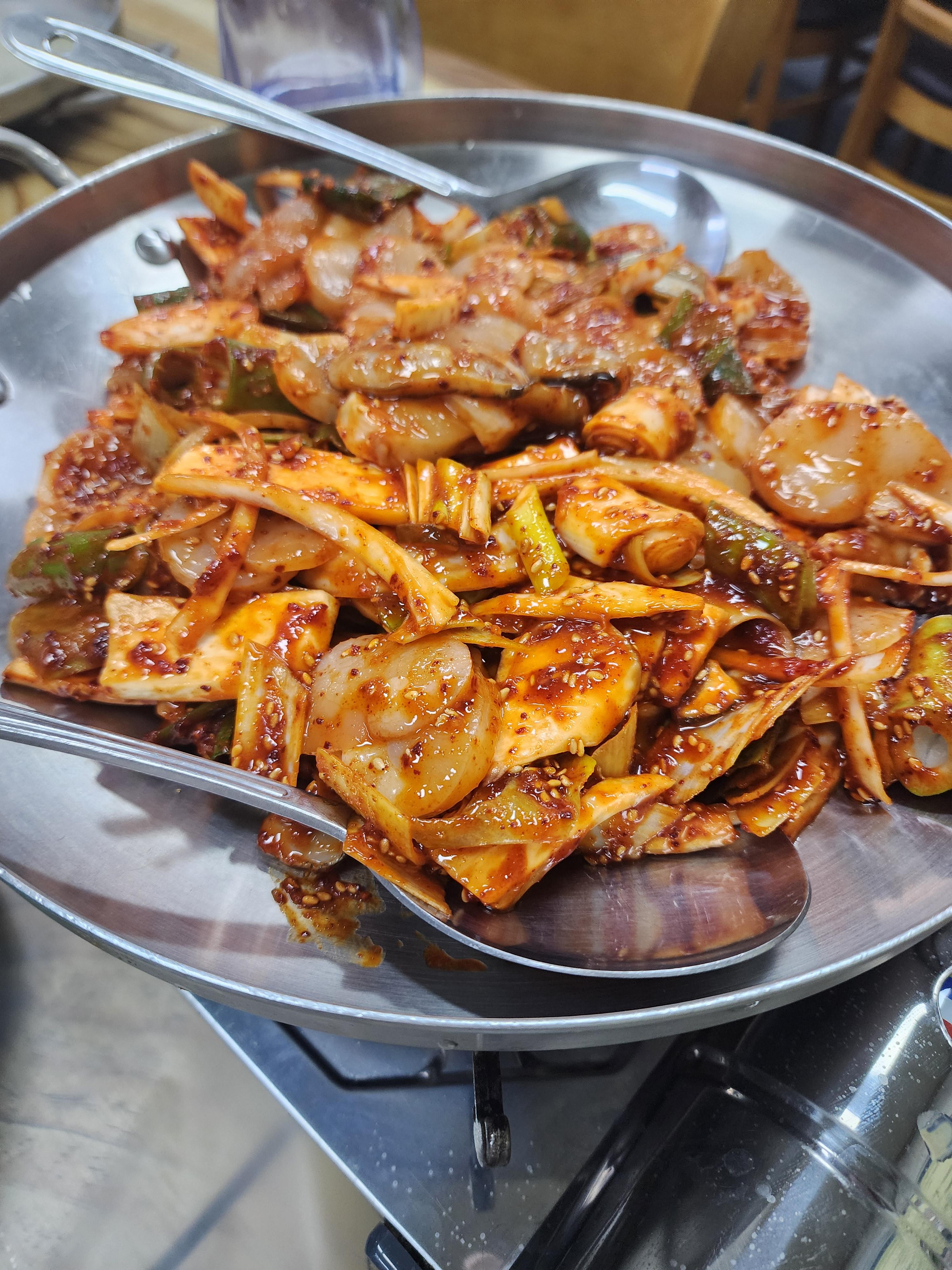 코스의 마지막을 장식한 건 바로 키조개 볶음이었어요! 보기만 해도 매콤달콤한 양념이 반짝반짝 윤기 나고,