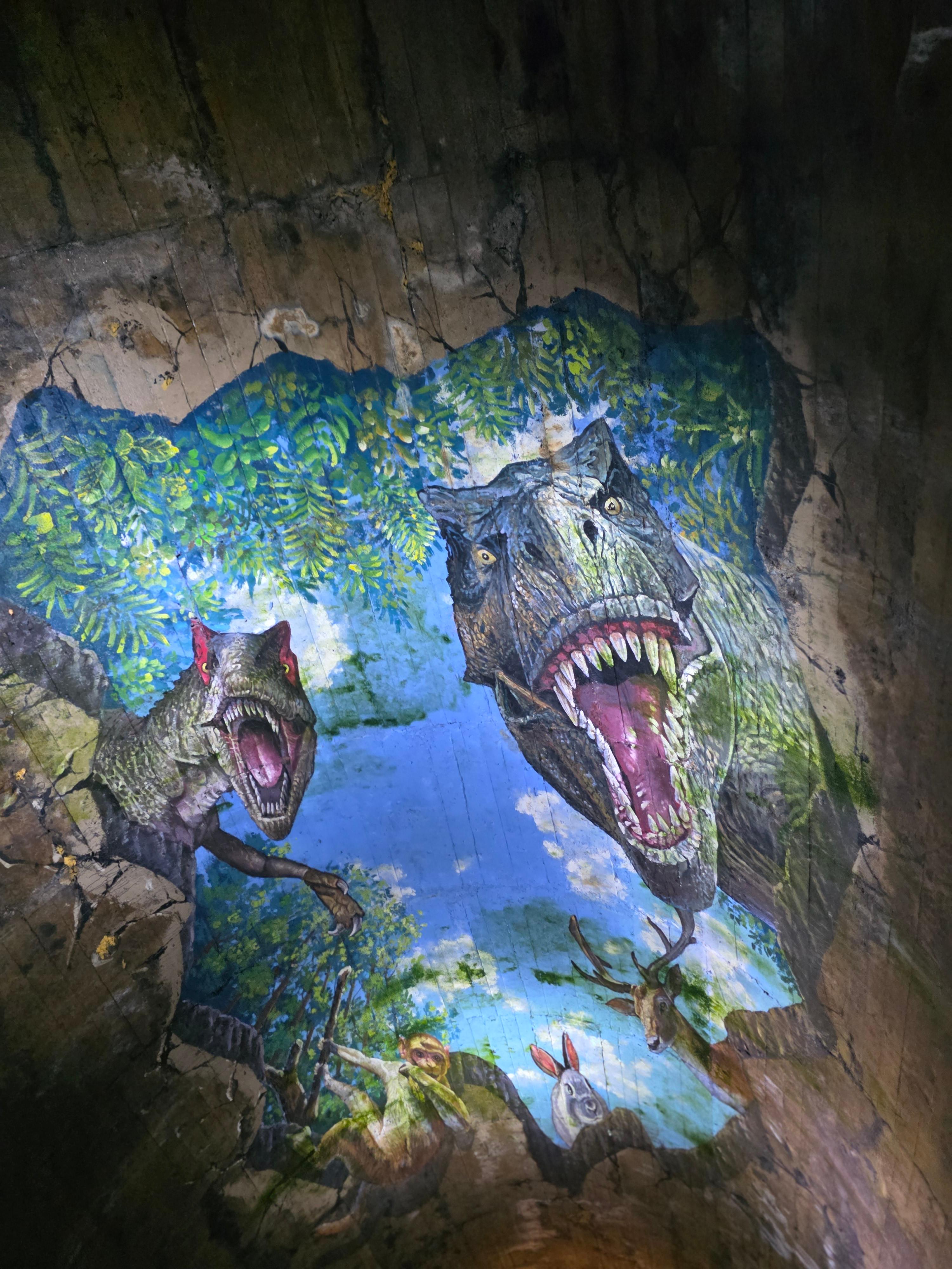 터널 입구는 마치 영화 속 한 장면처럼 숲속에 숨겨져 있었어요. 빨간 철골 프레임 아래로 초록빛 이끼가 가득하고,