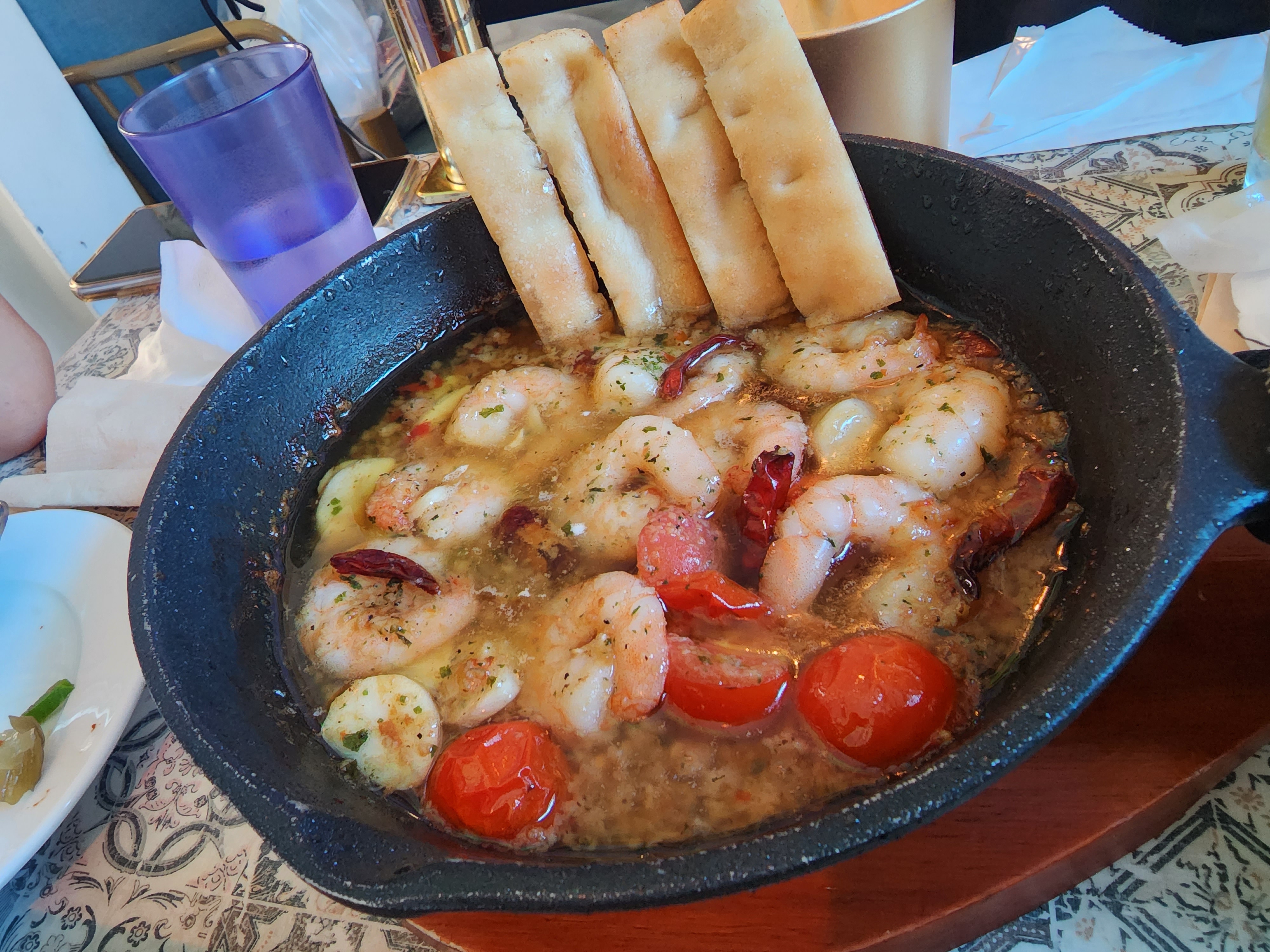 사진처럼 감바스는 올리브오일이 자작하게 깔려 있고, 새우와 마늘, 방울토마토, 건고추가 들어가 있는 게 특징이에요.