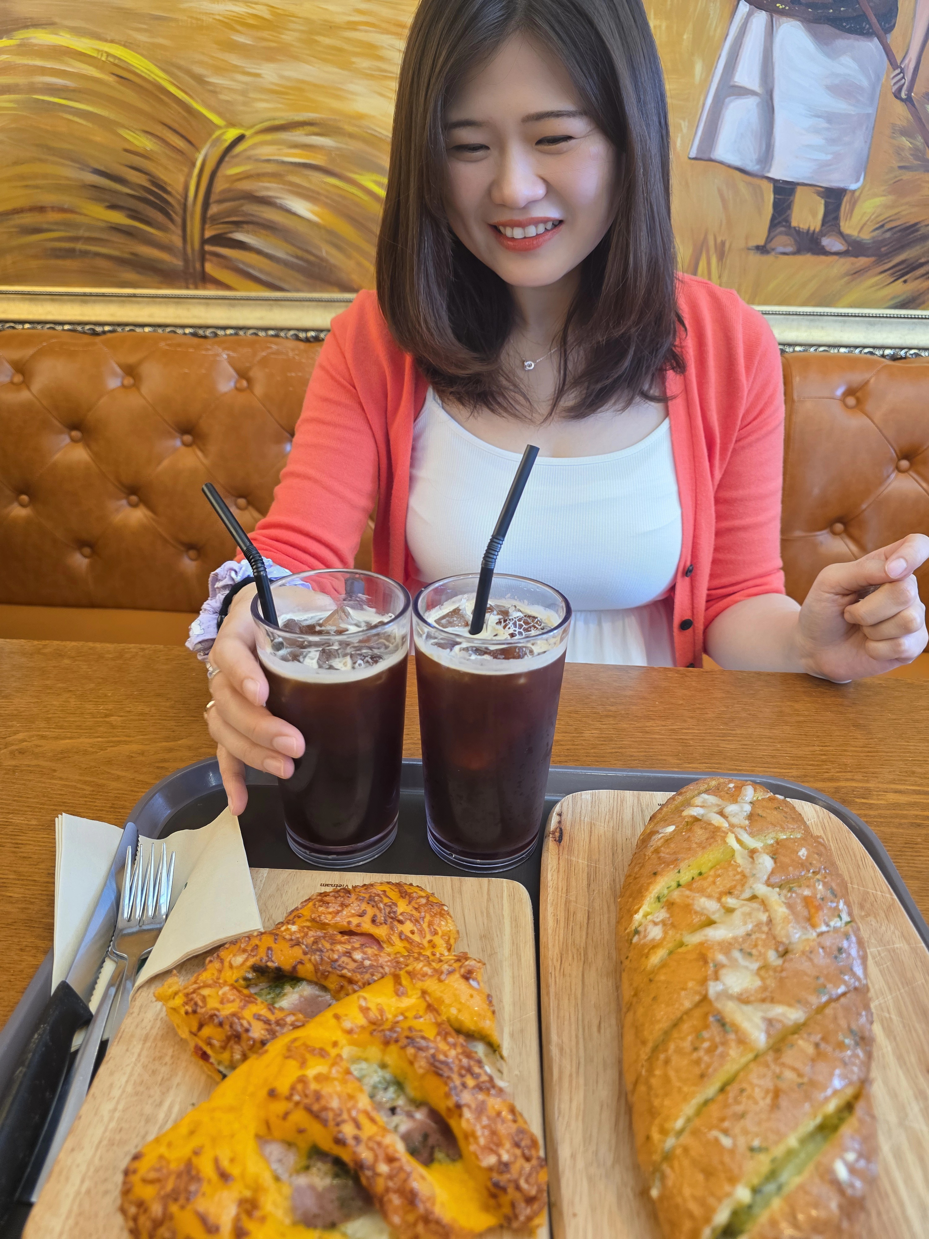 저는 마농바게트와 바질베이컨토마토빵, 그리고 아메리카노를 주문했어요. 아침부터 든든하게 먹고 싶어서 선택한 메뉴들이었죠.
