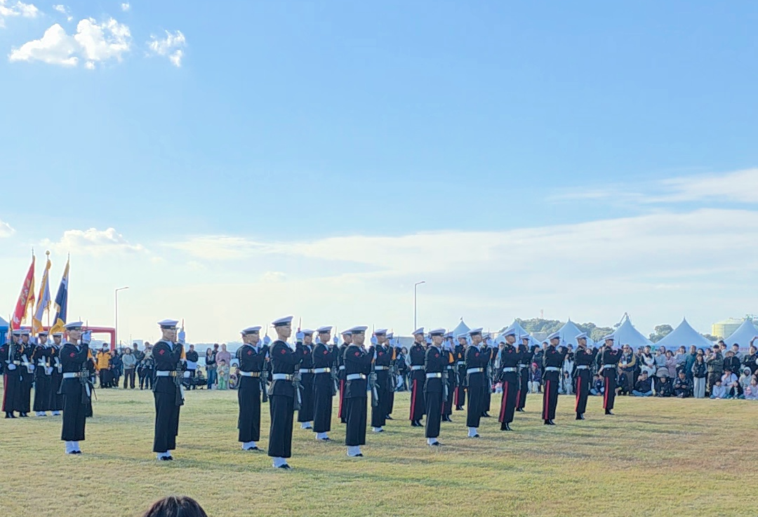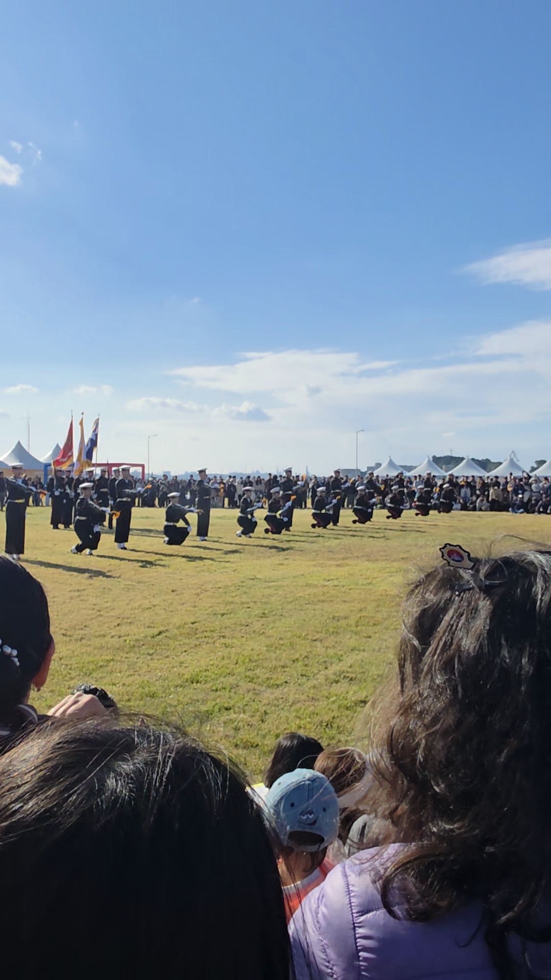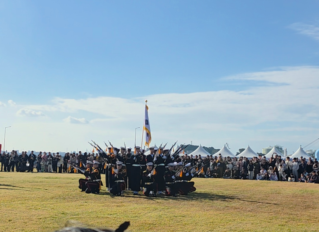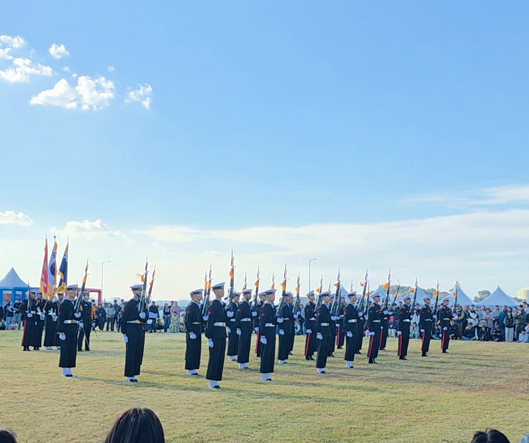 사진을 인화하고 나오는데, 멀리서 들려오는 우렁찬 구령 소리! 시선을 돌려보니 해군 의장대 시범이 시작되었어요.