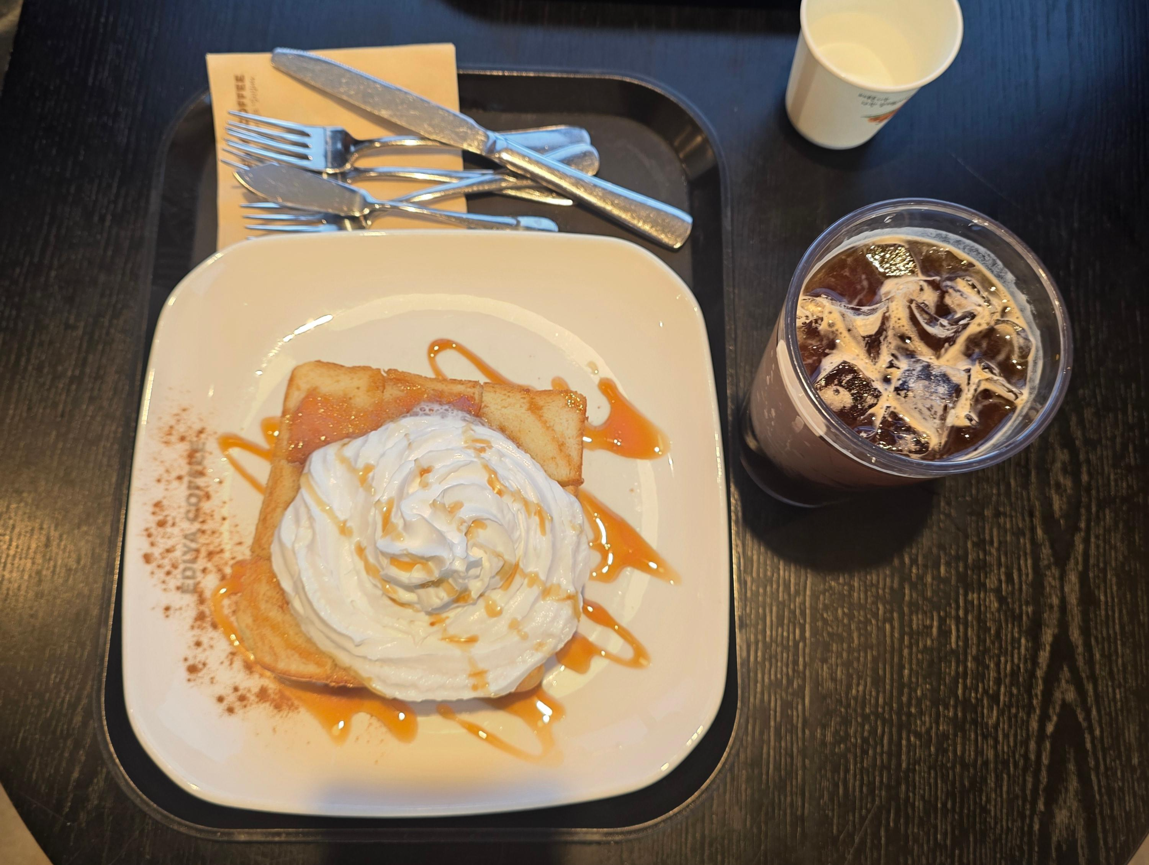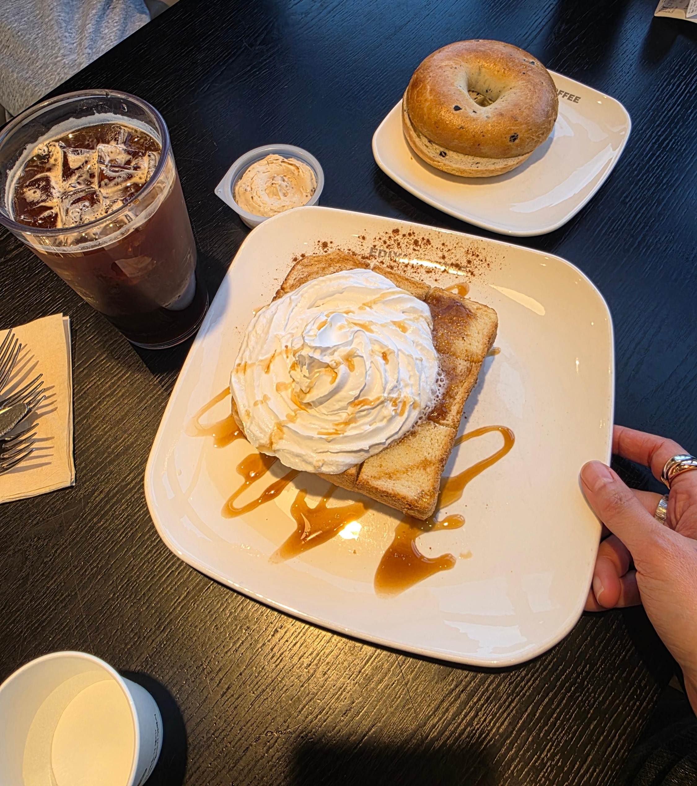 허니브레드는 위에 휘핑크림이 듬뿍 올라가 있고, 카라멜 시럽이 촤르르~ 보기만 해도 행복하죠.