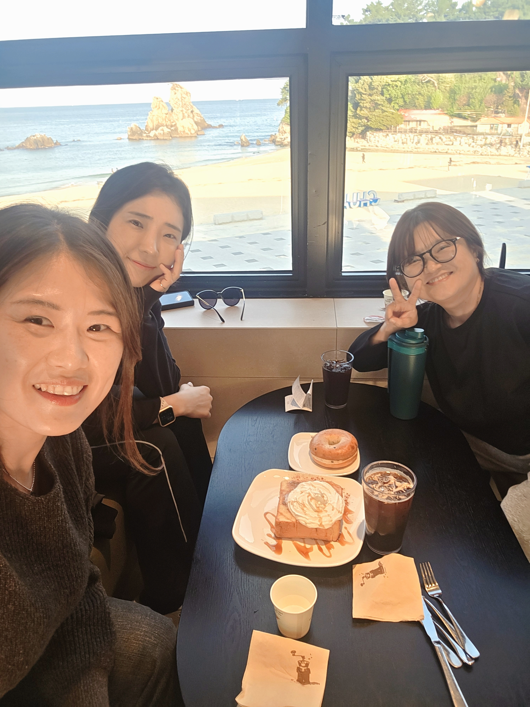 통창 너머로 바다가 한눈에 들어오고, 햇살이 부드럽게 들어와서 너무 따뜻했어요.