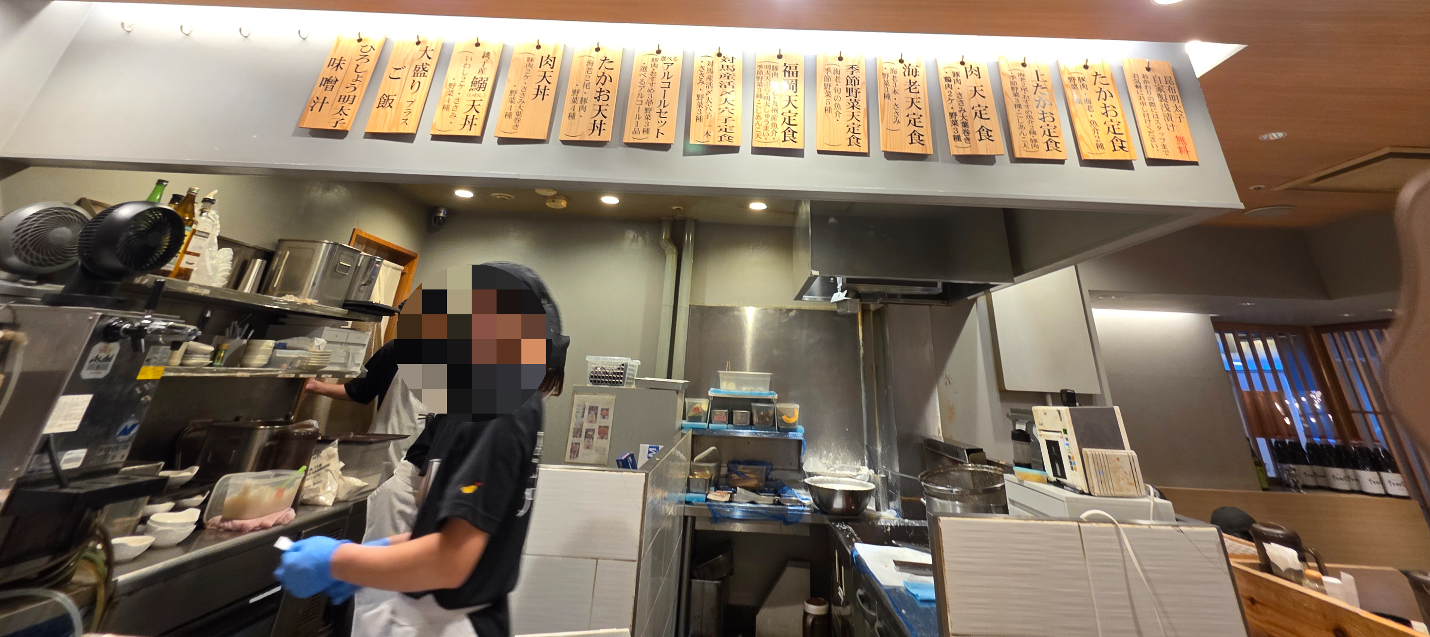 내부는 따뜻한 조명 아래 나무 인테리어로 꾸며져 있고, 가게 안쪽엔 일본인 셰프들이 분주하게 튀김을 준비하고 있었어요.