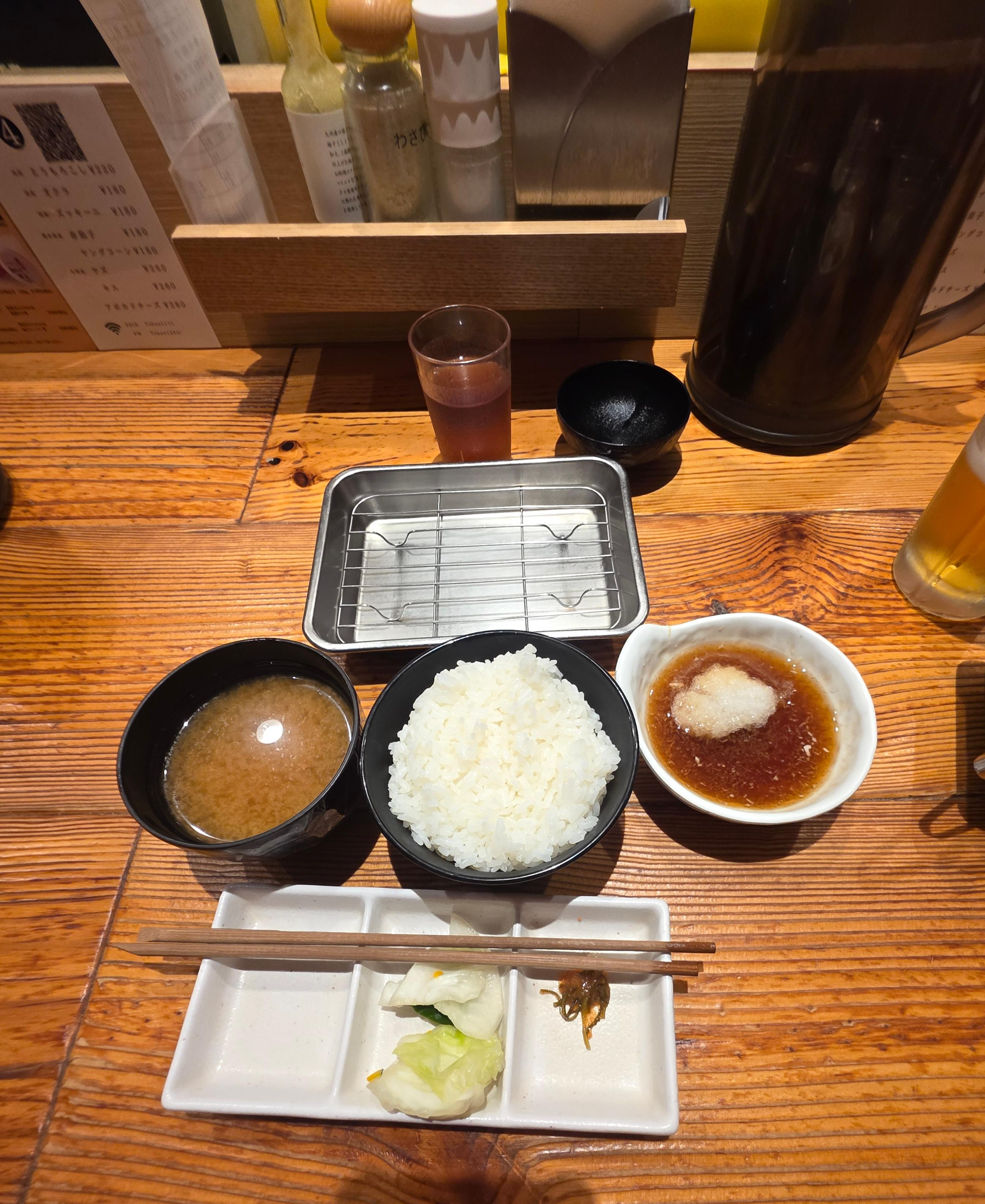 모두 밥 + 된장국 + 튀김 + 소스 + 반찬 세트로 구성돼 있었어요. 여기에 맥주!!