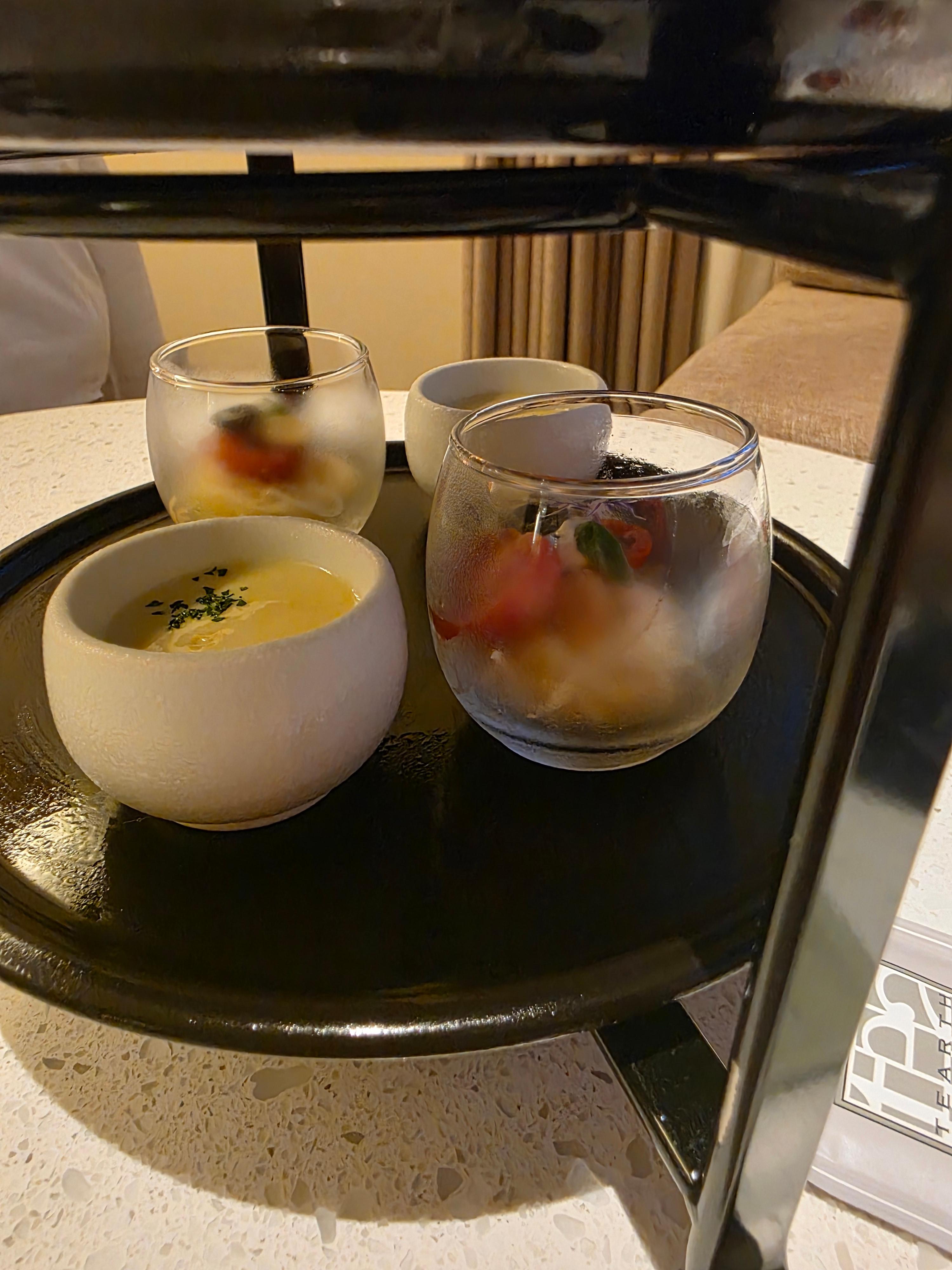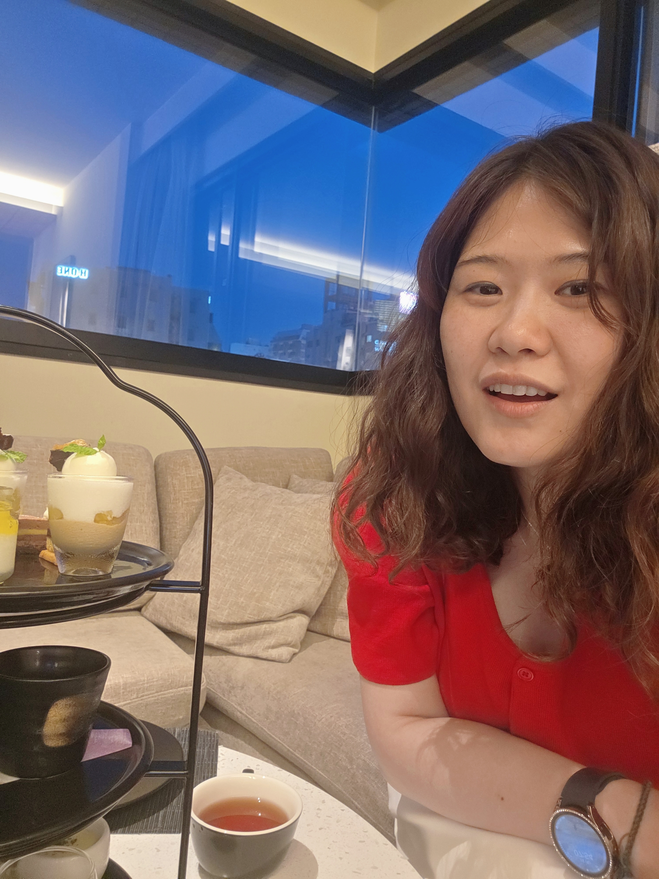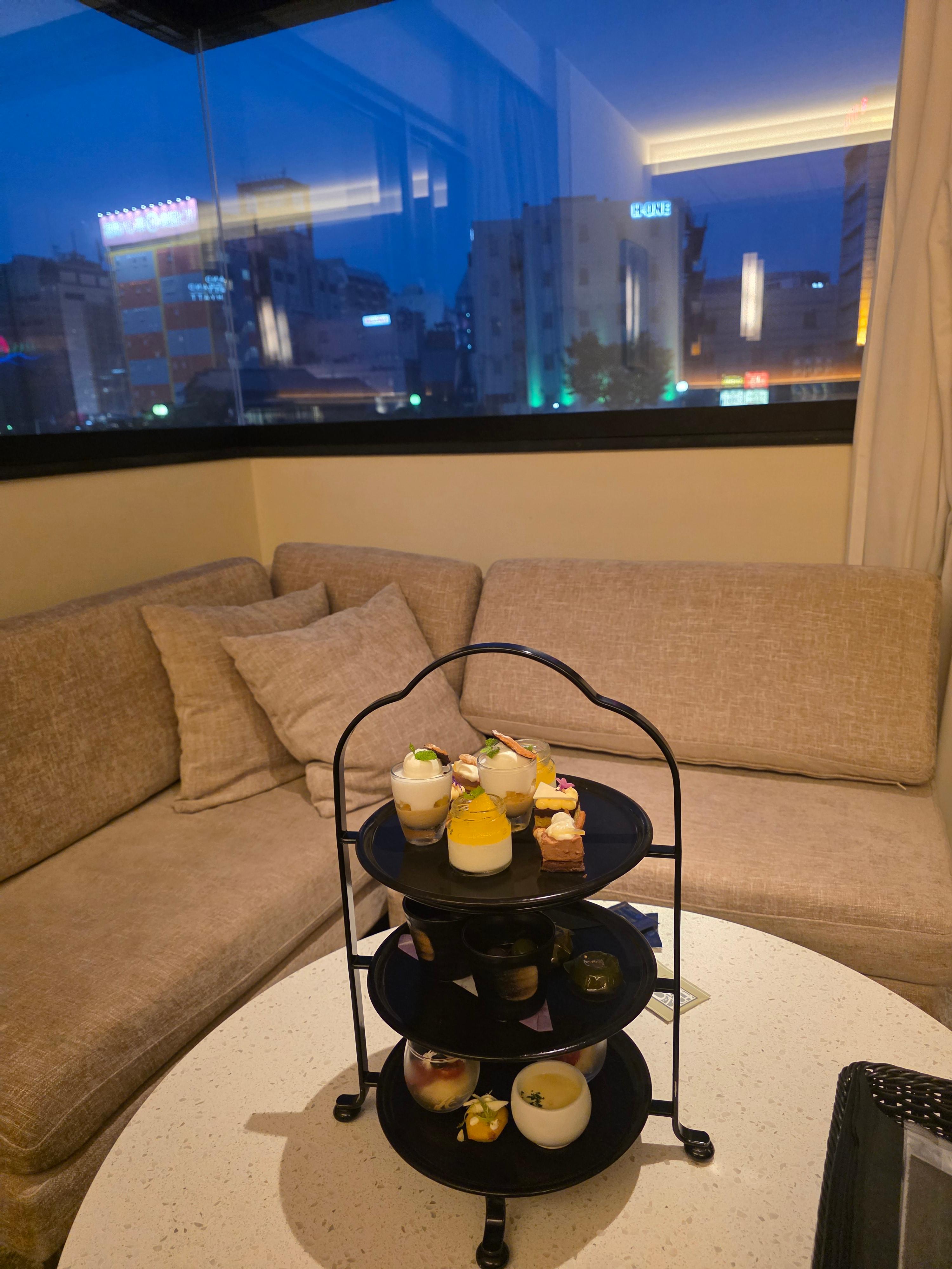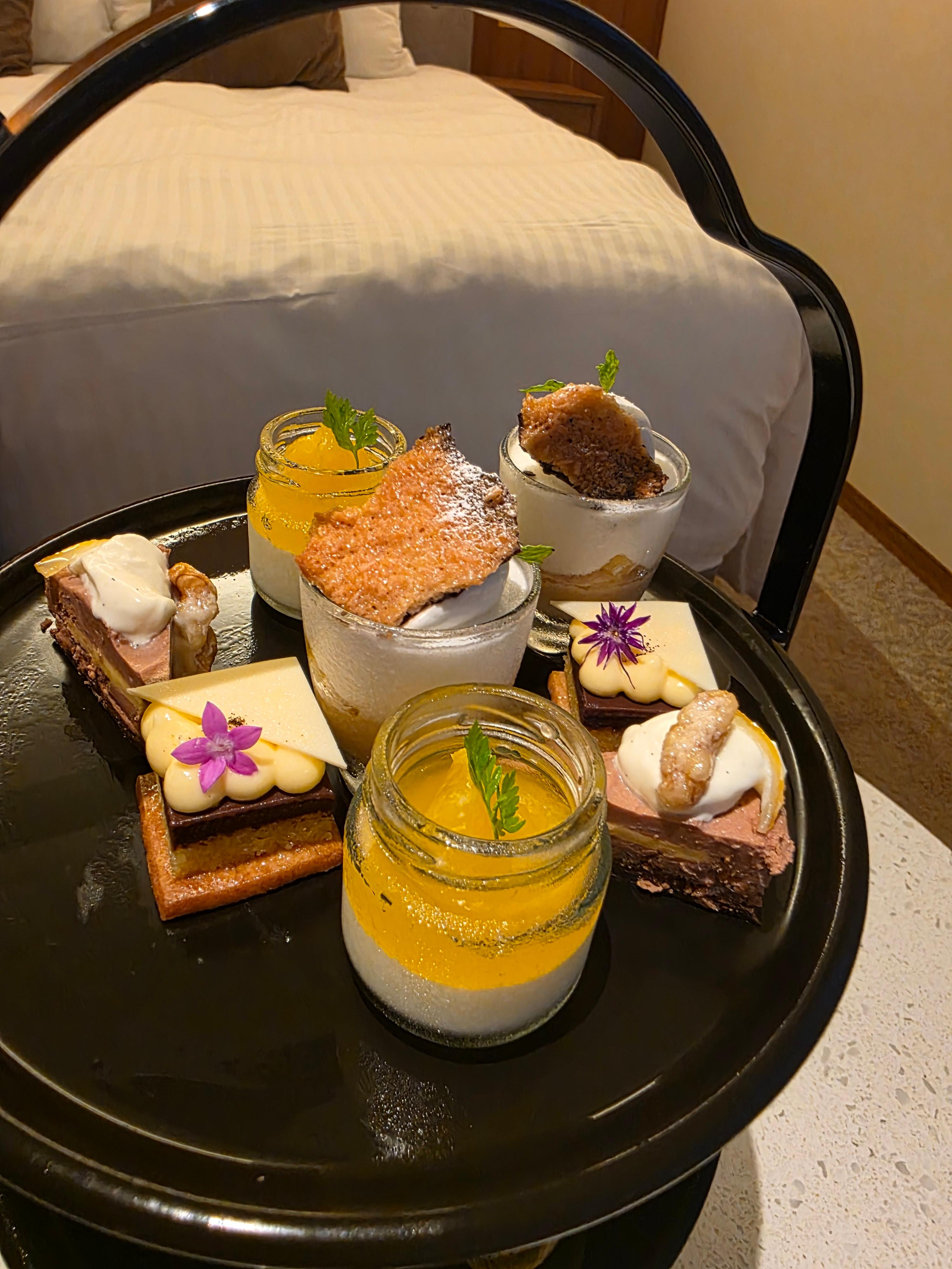객실로 직접 세팅해주시는데, 3단 트레이에 디저트 구성이 예술이에요.