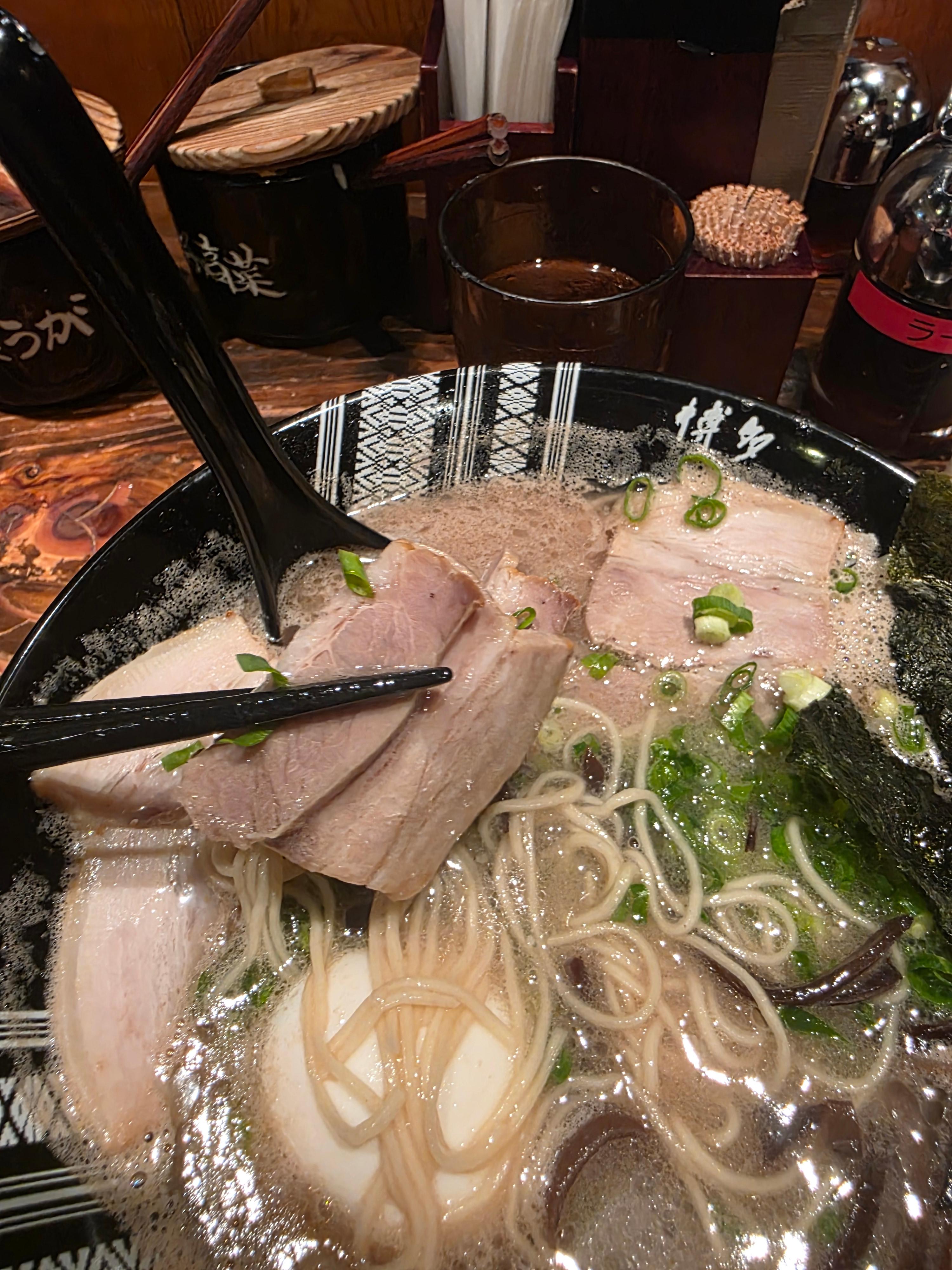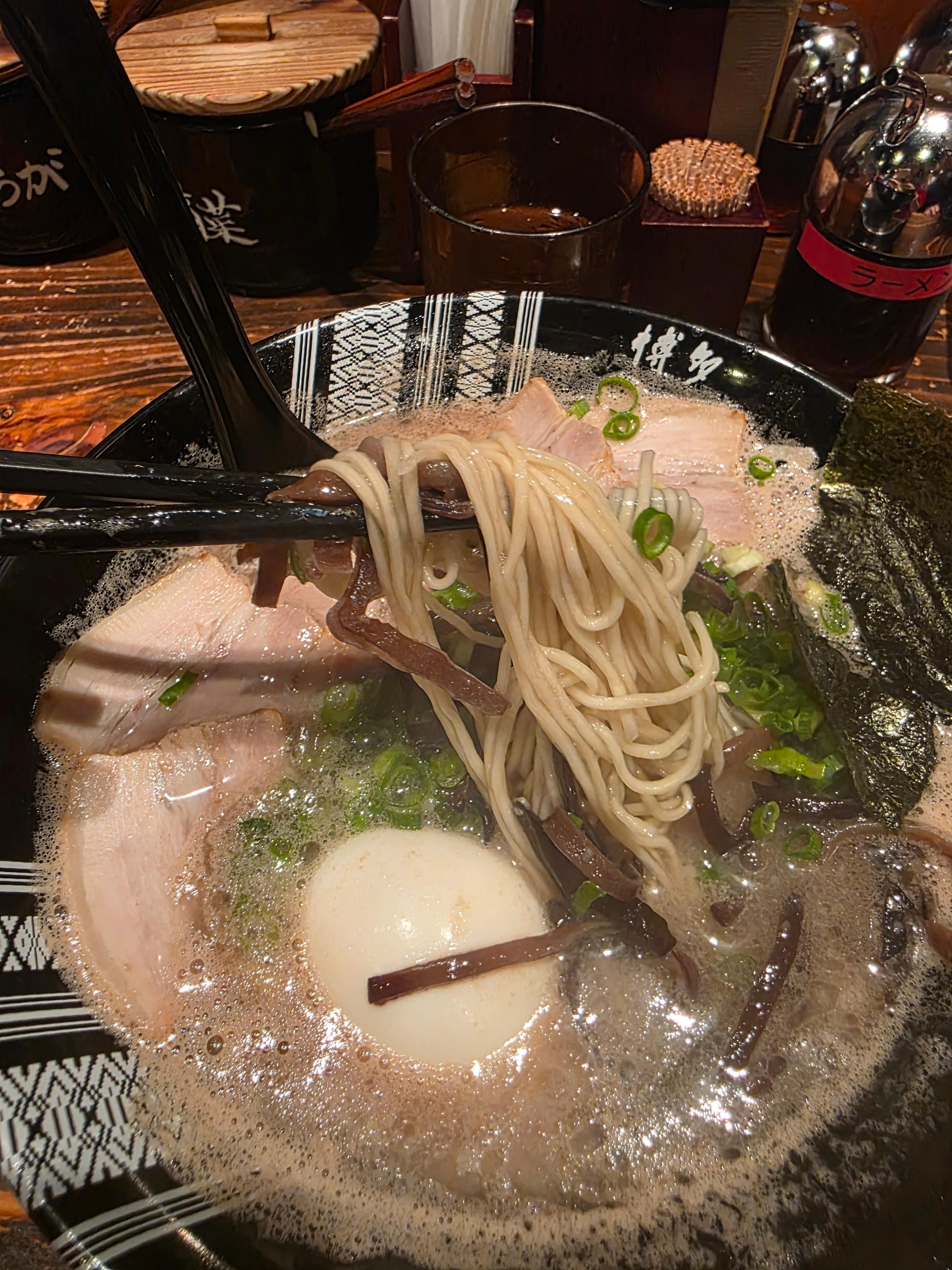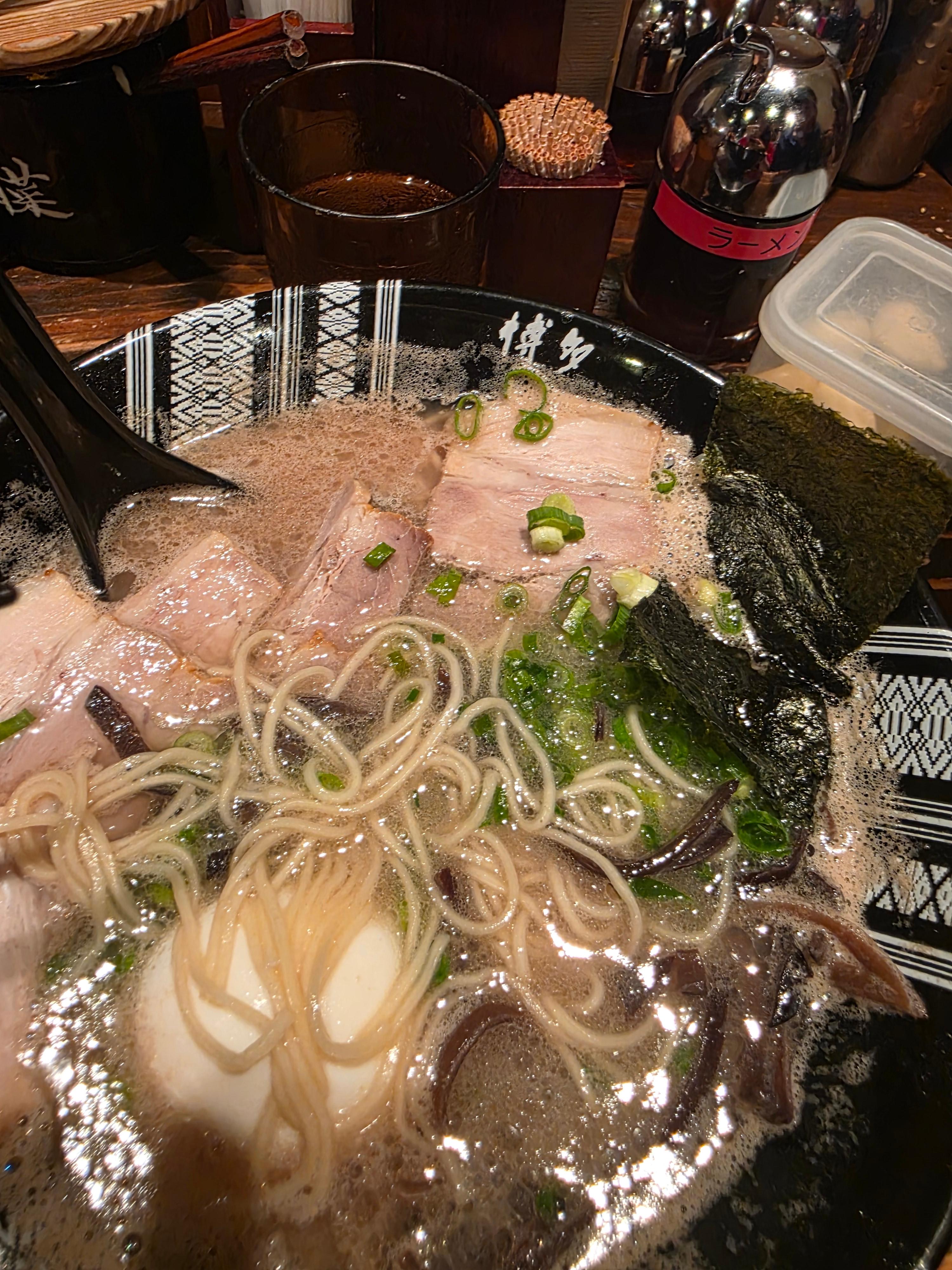 첫 인상부터 국물 색이 깊었어요. 하카타 특유의 진한 돈코츠 스프에 부드러운 차슈가 넉넉하게 올려져 있고,