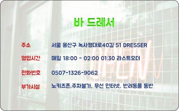 녹사평에서 이태원으로 넘어가는 길, 살짝 올라가는 골목 위에 조용히 자리 잡은 바 드레서.