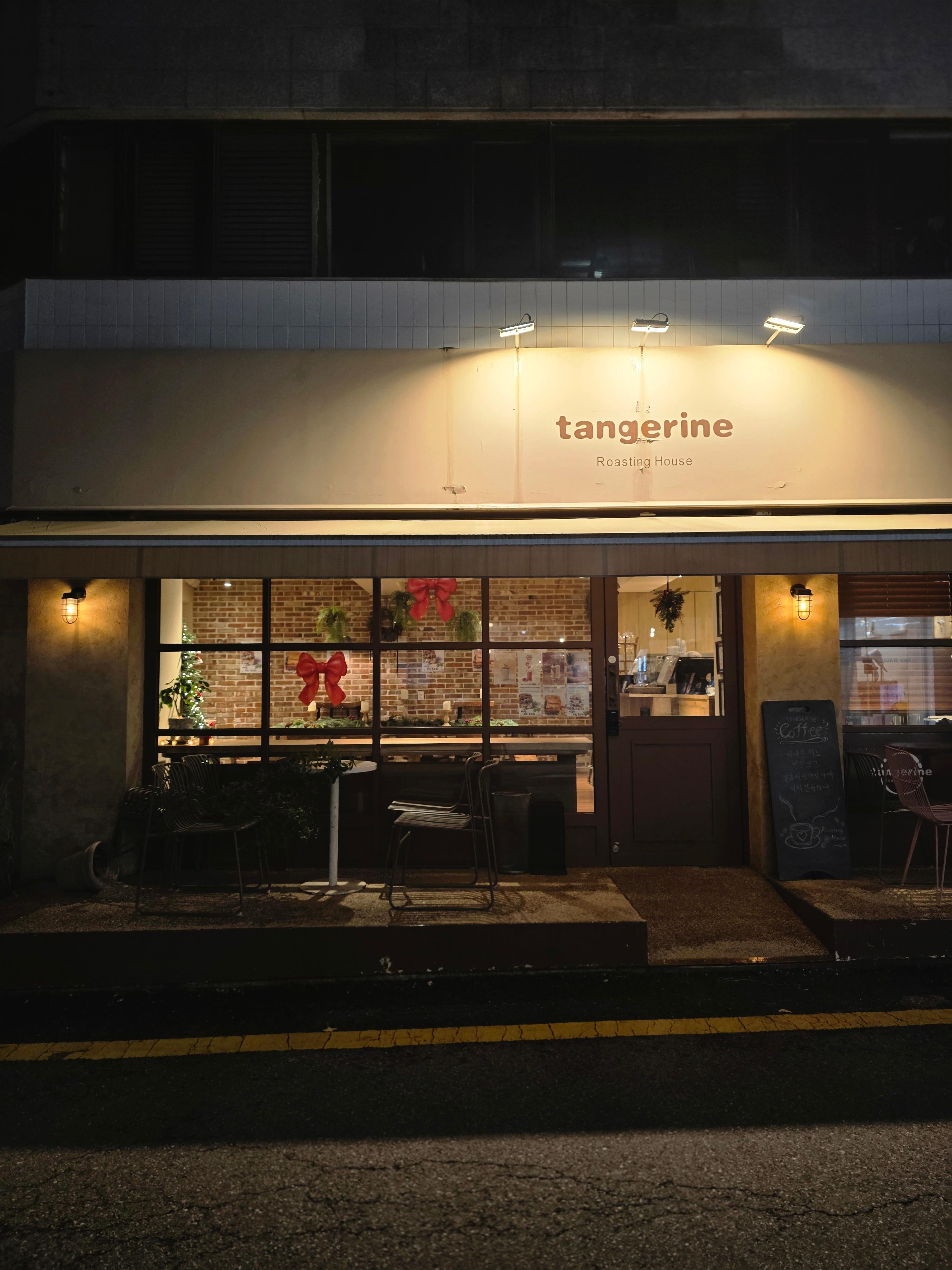 강남대로에서 골목 안쪽으로 한 블록만 들어오면 베이지 톤 외관에 “tangerine Roasting House” 간판이 딱 보여요.
