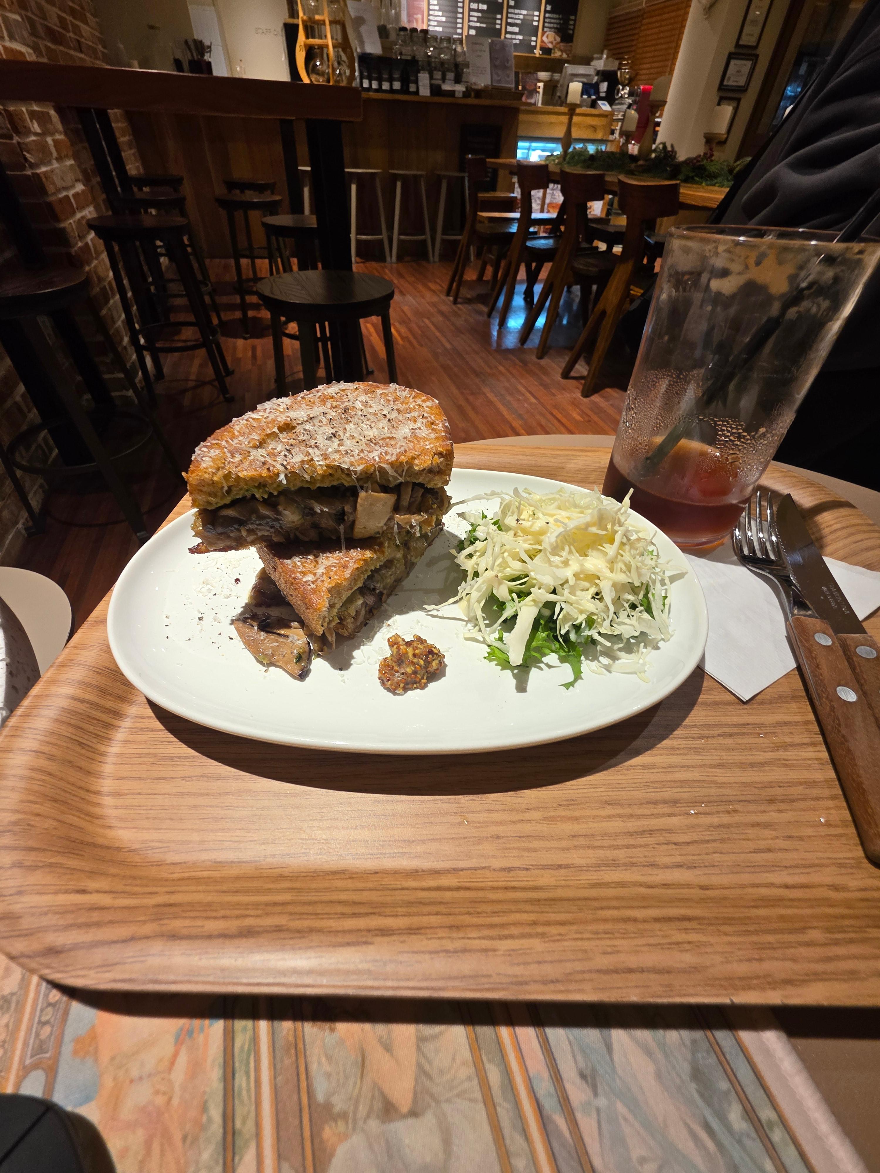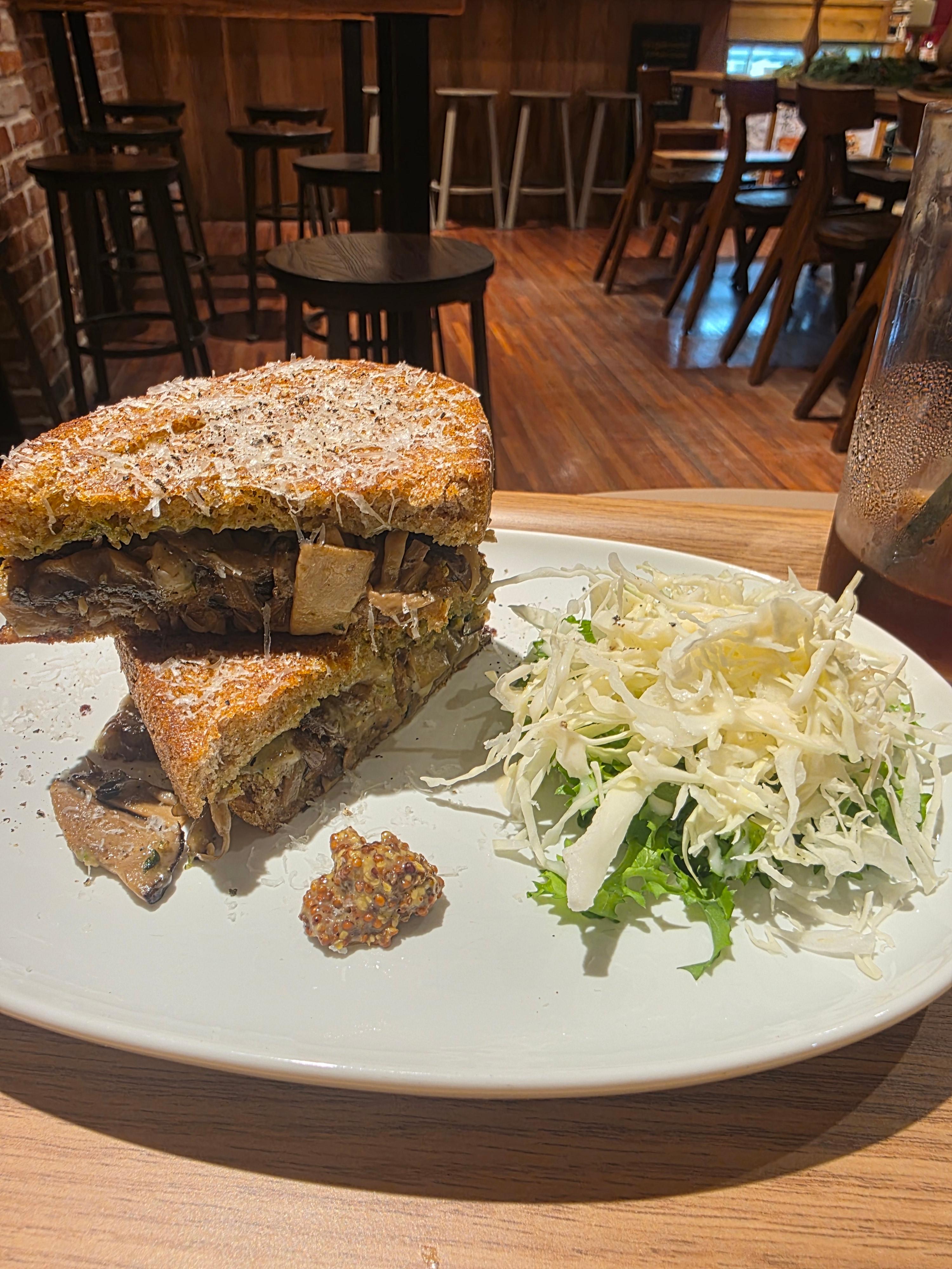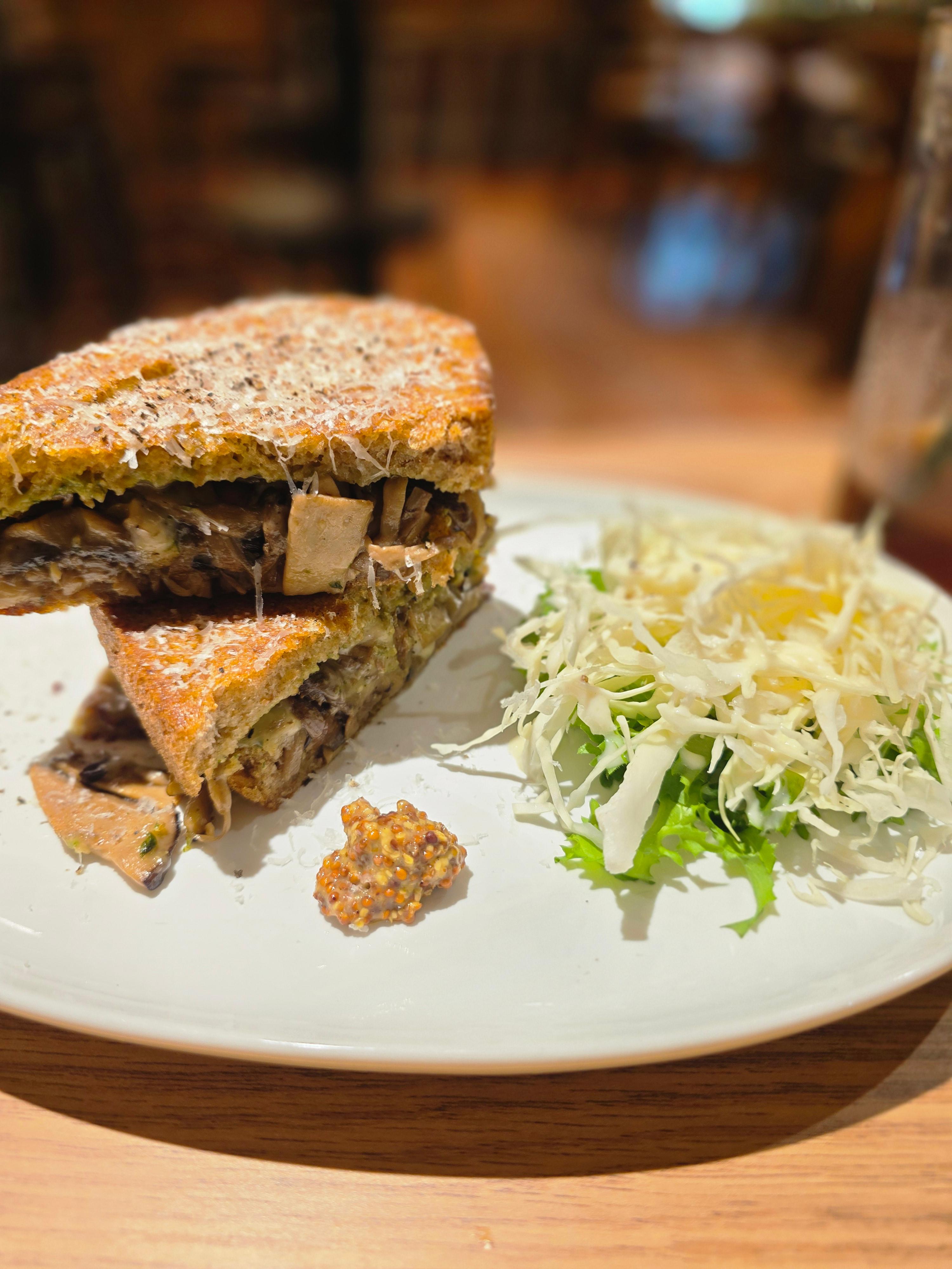 진짜 비주얼 보고 "헉 뭐야?" 했어요. 도톰한 곡물빵 사이에 버섯이 엄청 푸짐하고