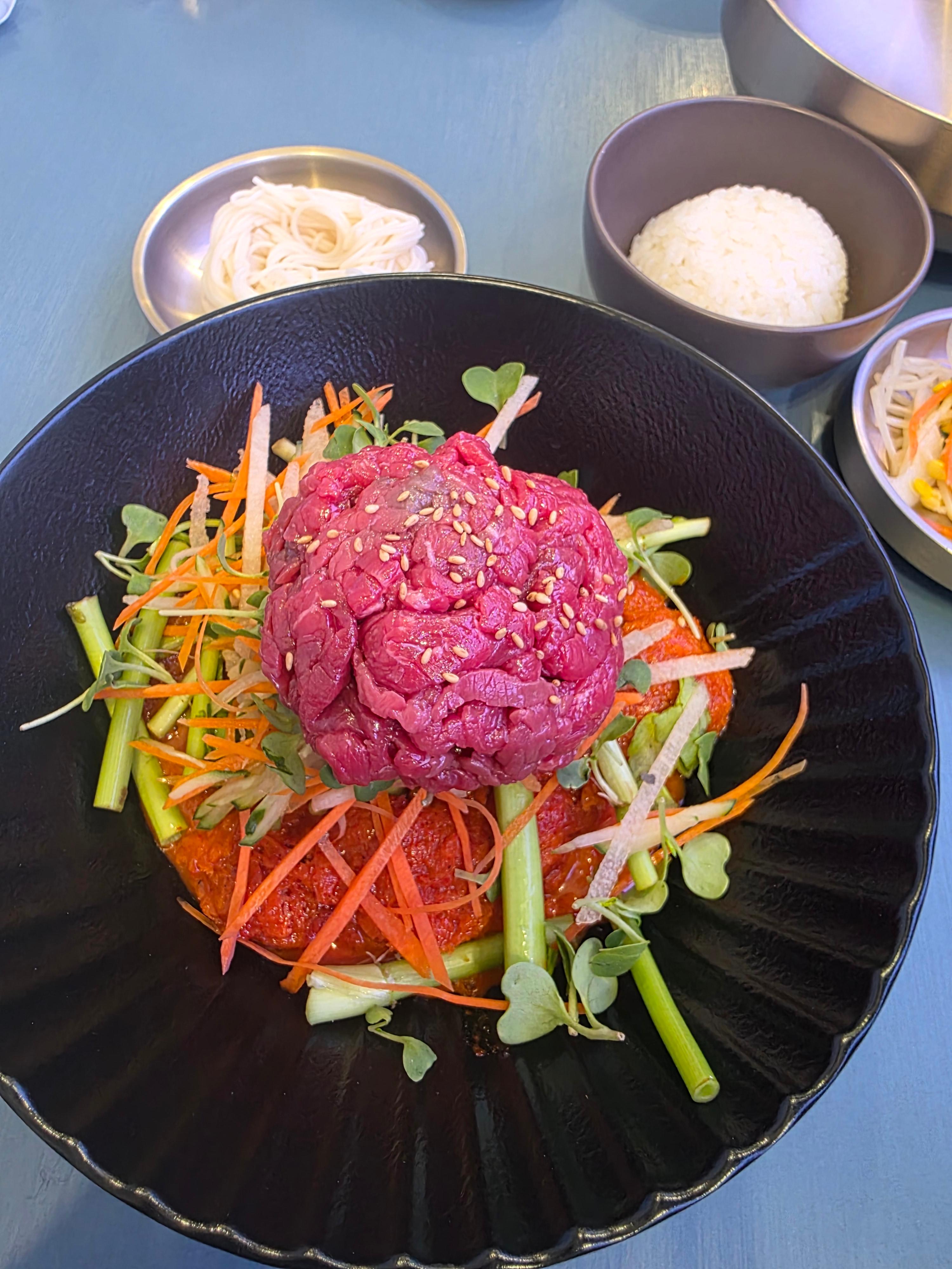 특제 소스가 진짜 미쳤고요, 살얼음 낀 소스 국물에 신선한 한우 육회가 녹진하게 어우러집니다.