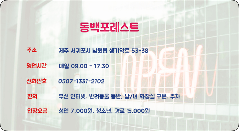 - 주소: 제주 서귀포시 남원읍 생기악로 53-38
