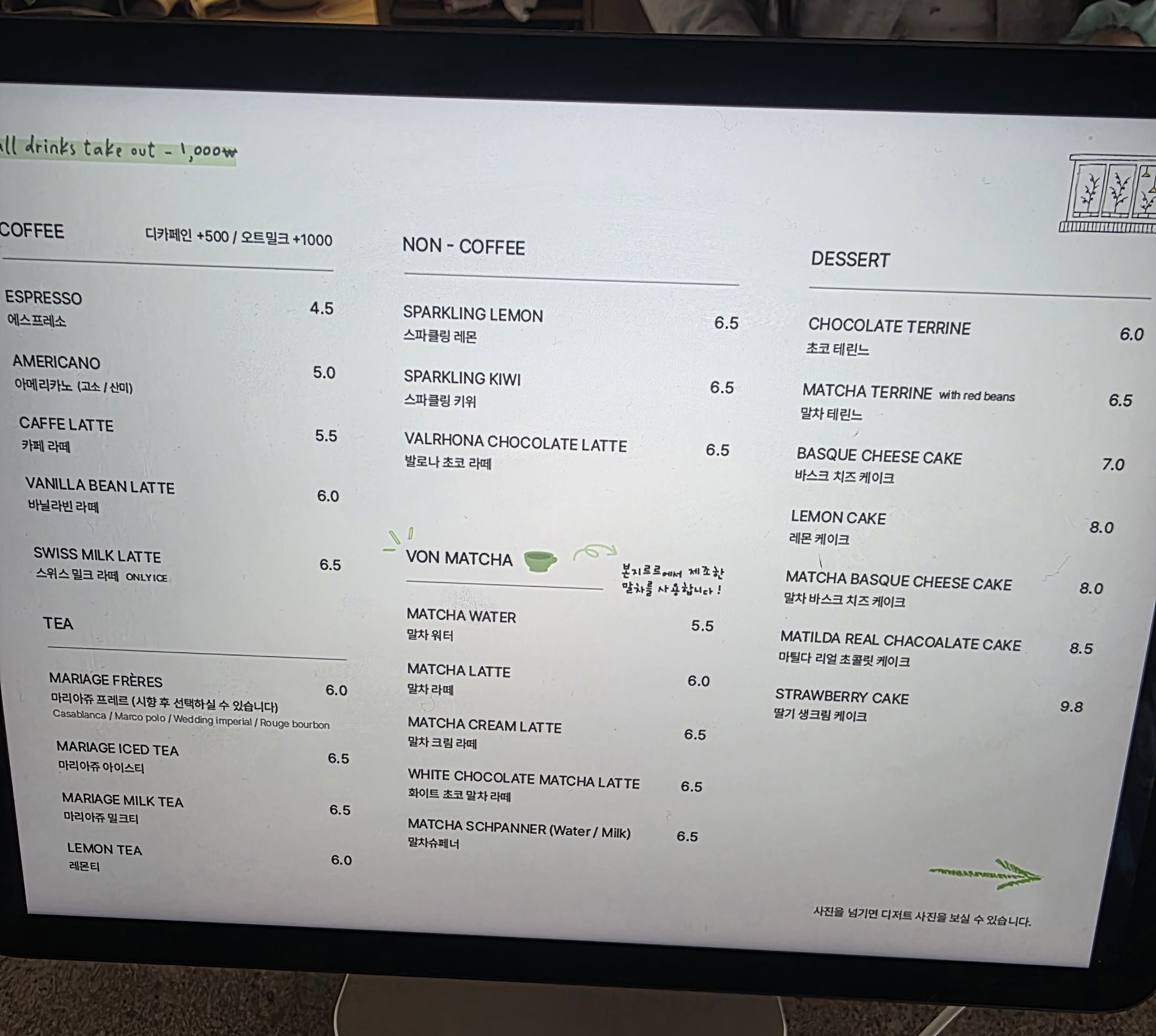가격대는 대체로 4.5~9.8 정도(표기 기준)로, 신사역 카페치곤 납득 가능한 편이었습니다.