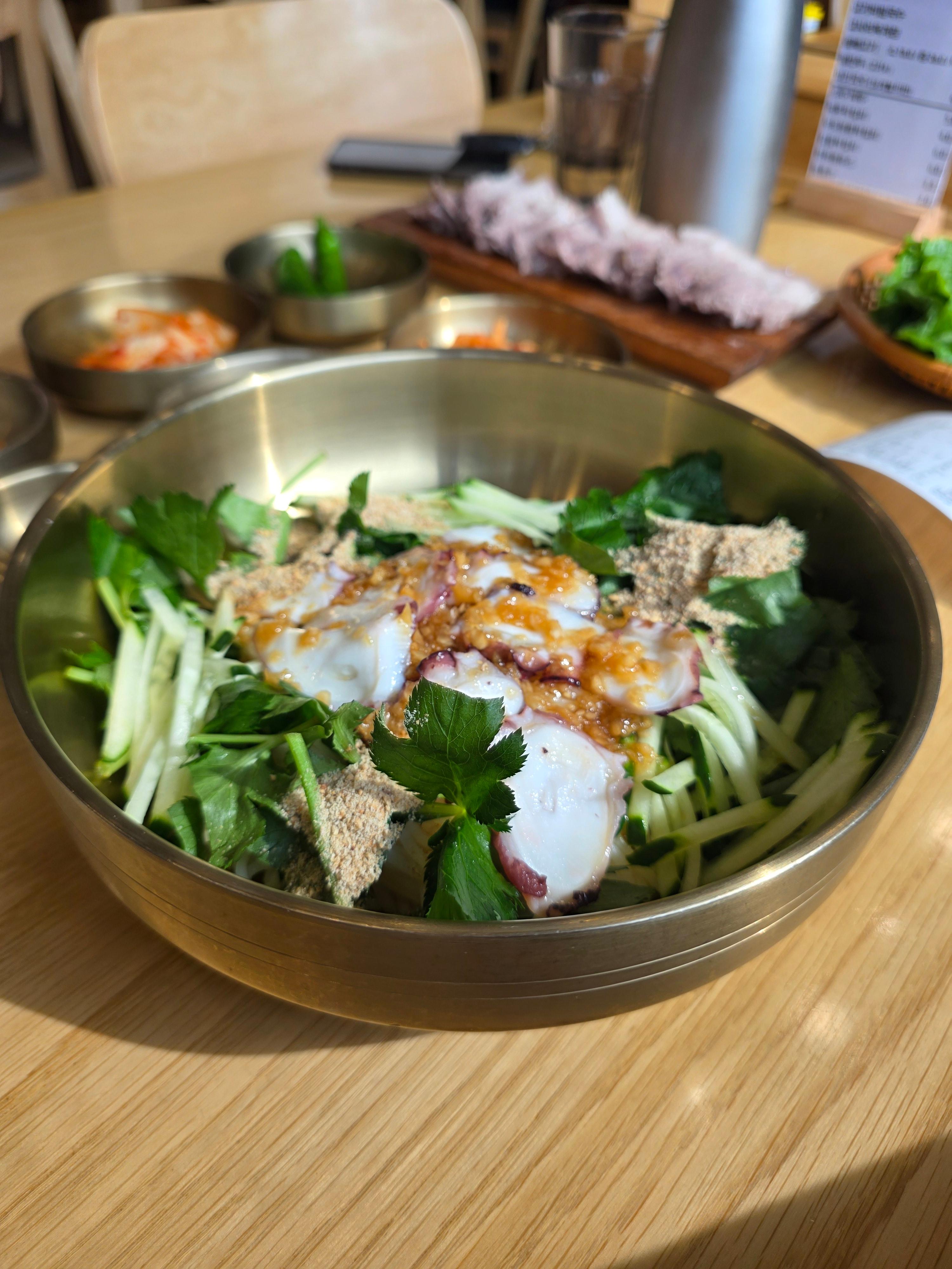 돌문어는 탱글탱글하고, 참나물이랑 같이 먹으니까 입안이 너무 개운해요.