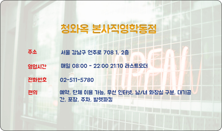 그래서 이야기 나온 김에 “그럼 오늘 가보자” 하고 바로 다녀오게 된 곳이 바로 청와옥 본사직영학동점이었습니다.