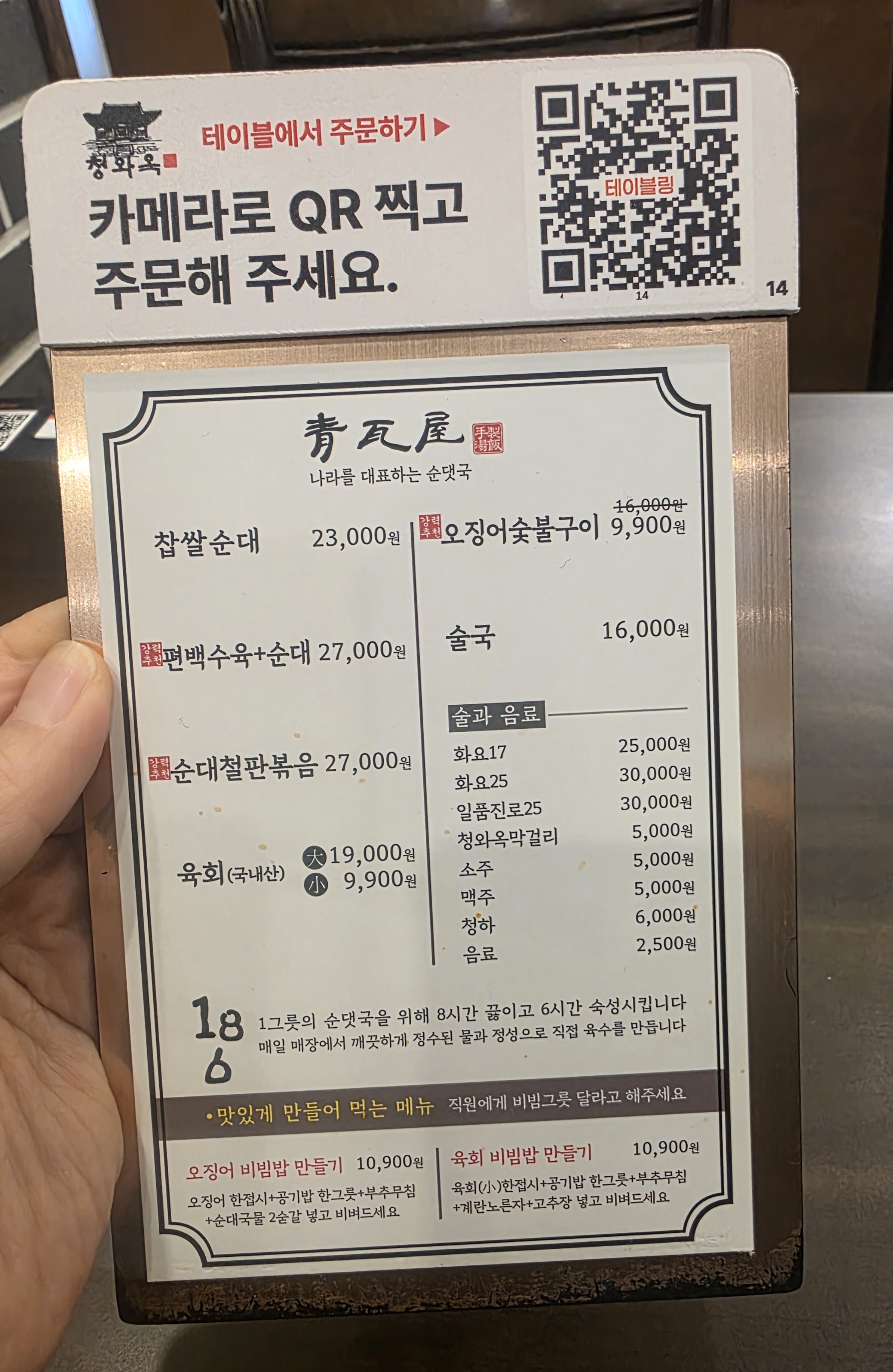 청와옥은 순대국밥 전문점답게 메뉴 구성이 딱 정리되어 있어요.