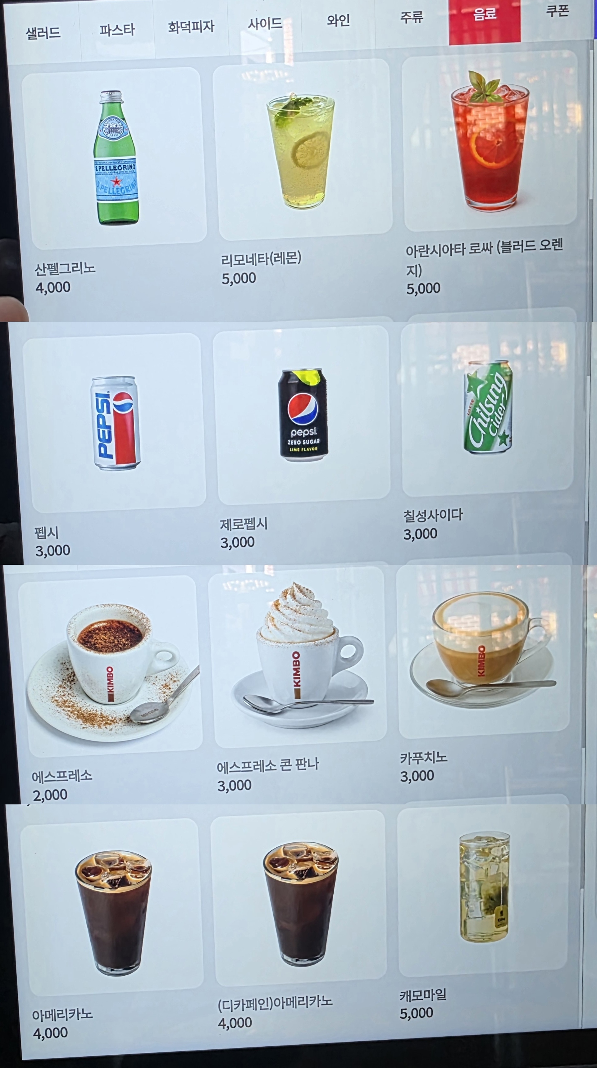 예전에는 일반 메뉴판이었는데, 지금은 키오스크 주문으로 바뀌었어요. 훨씬 편하고 메뉴도 한눈에 보기 좋아졌습니다.