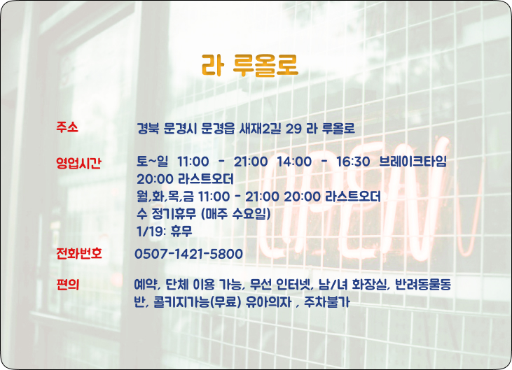 라 루올로는 문경새재 근처에 위치해 있어서, 여행 중 식사 코스로 넣기 딱 좋아요. 문경 가볼만한 곳과 동선도 좋아서, 데이트, 가족 외식, 여행 코스 식당으로 추천합니다.