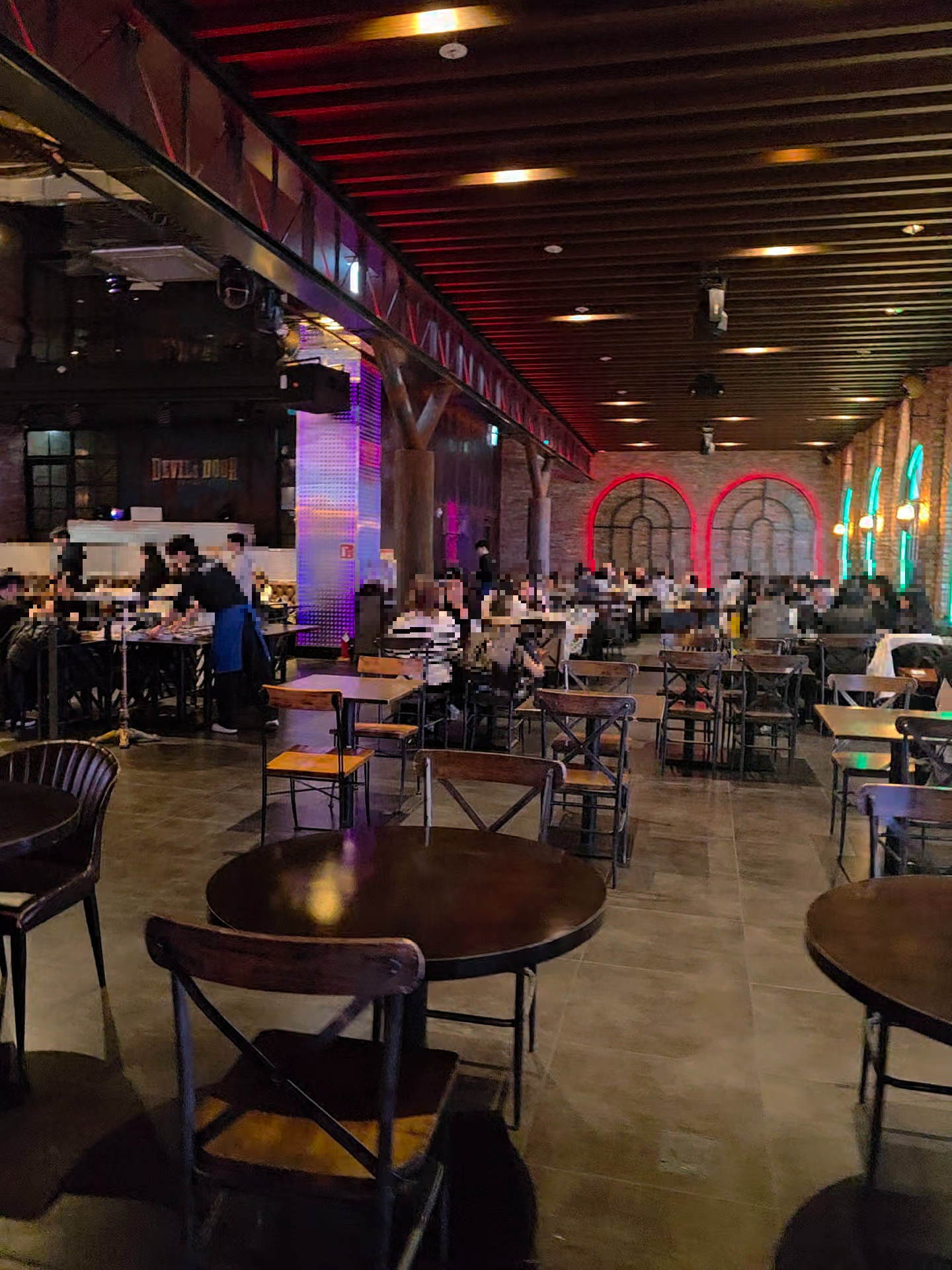 테이블 간격도 넓고, 특수 조명과 DJ 부스까지 갖춘 구조라 단순한 맥주집이 아니라 복합문화공간 느낌이 강했어요.