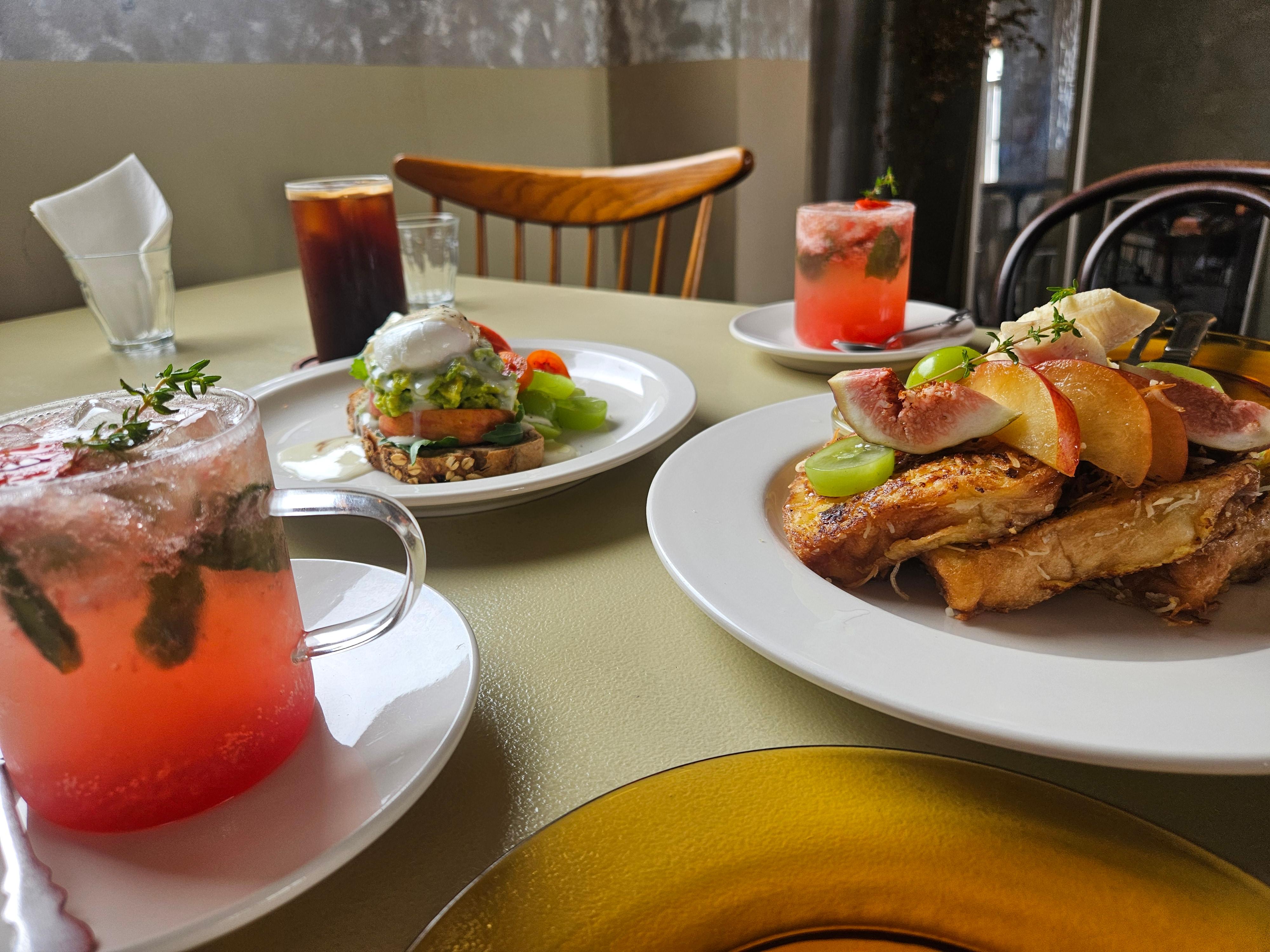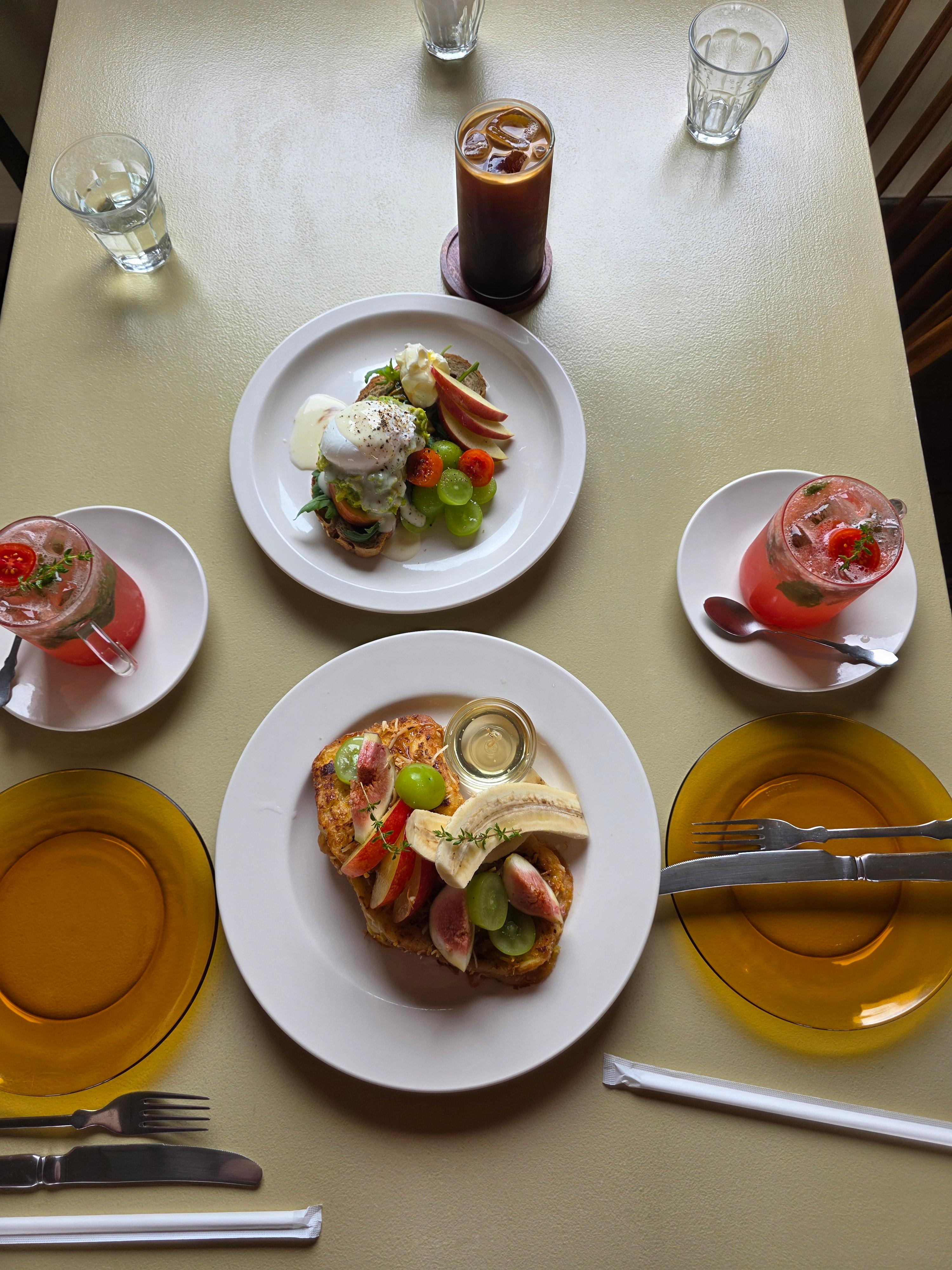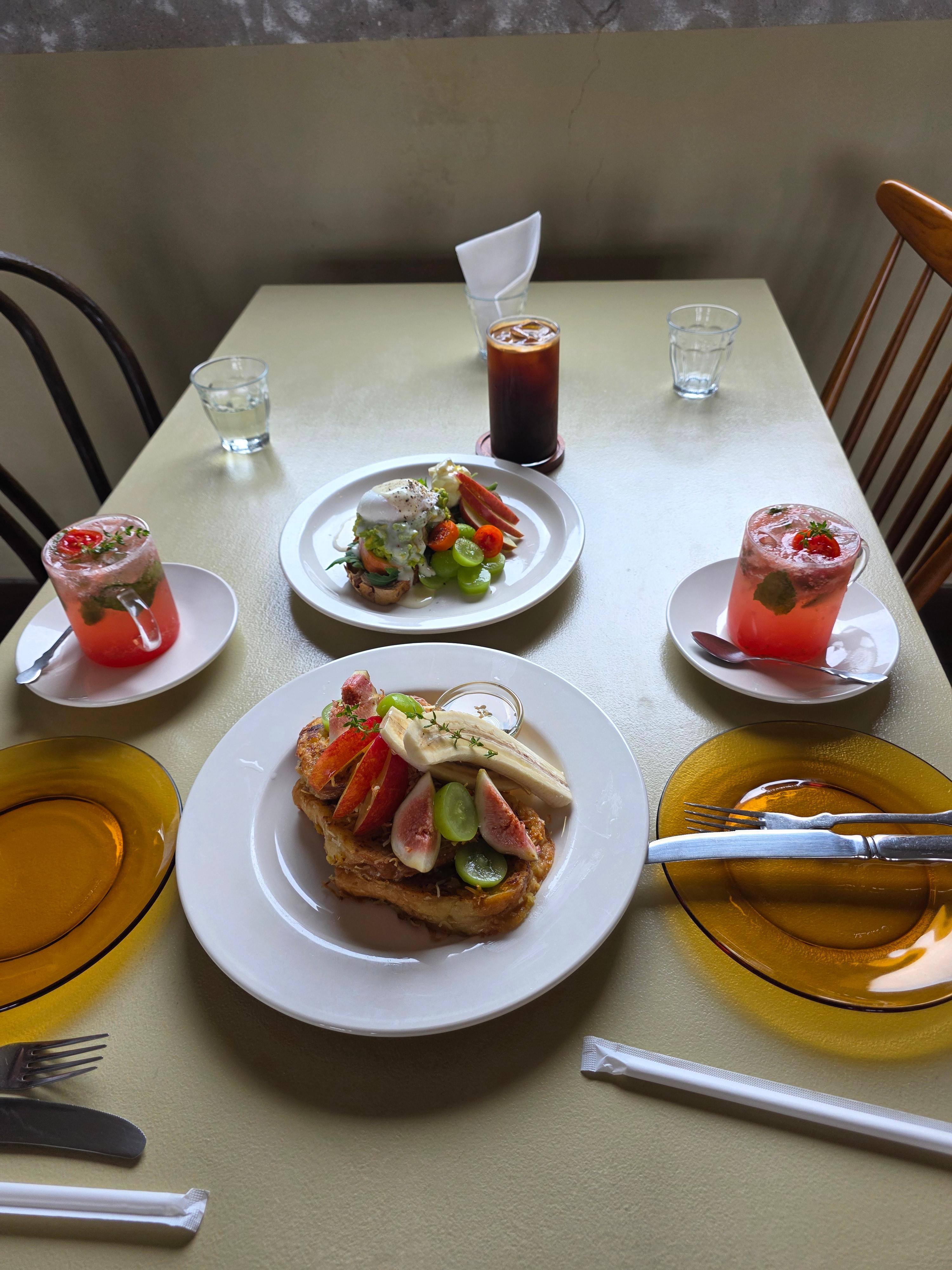 저희는 아보카도 에그 베네딕트, 해피준(코코넛 프렌치토스트 & 제철 과일, 벌꿀), 제주 감자 스프, 구좌 당근 스프, 아메리카노, 토마토 바질에이드를 주문했습니다. 사실 half 메뉴는 안되는데 사장님께서 배려해주셔서 가능하게 해주셨어요.