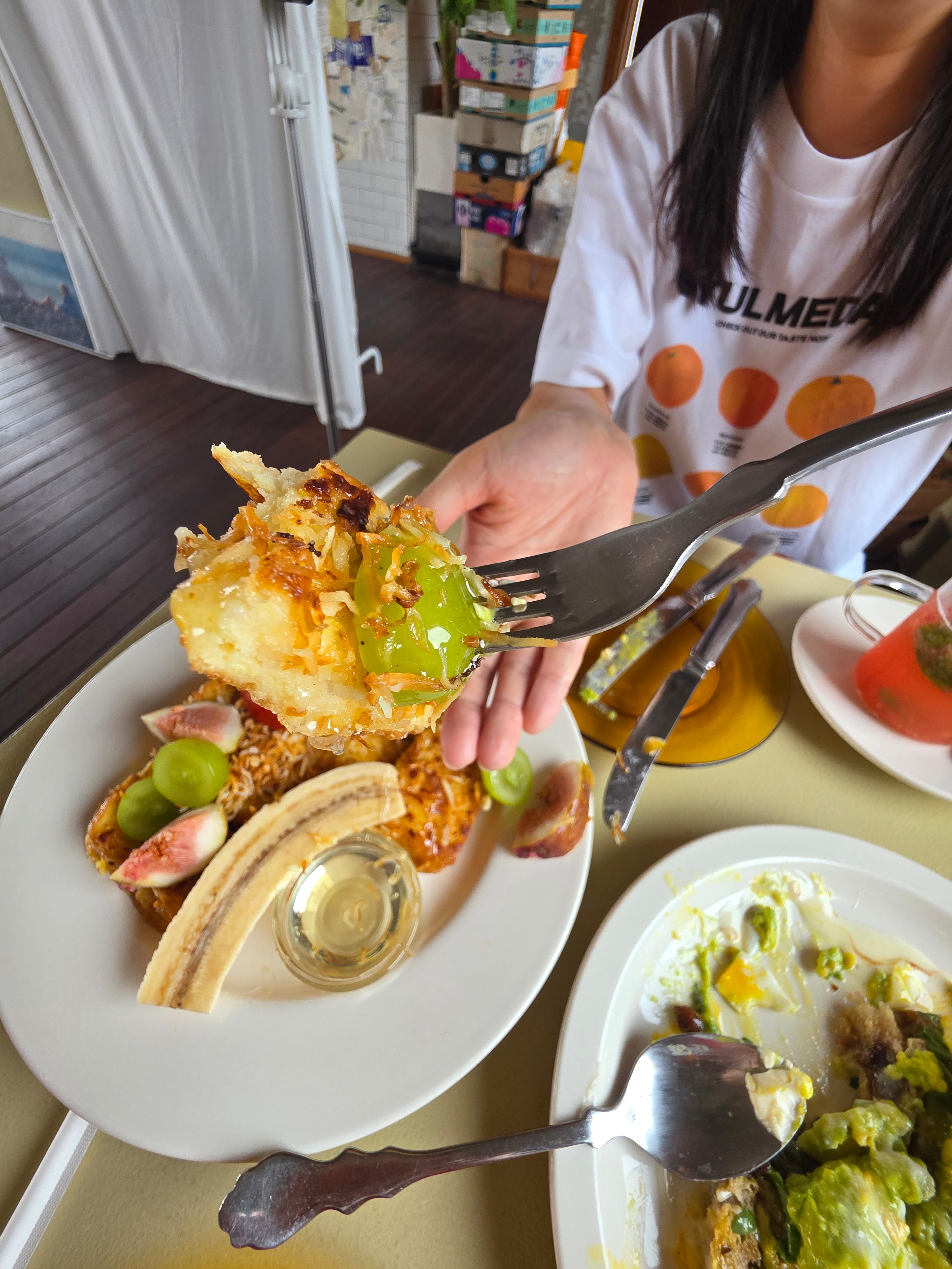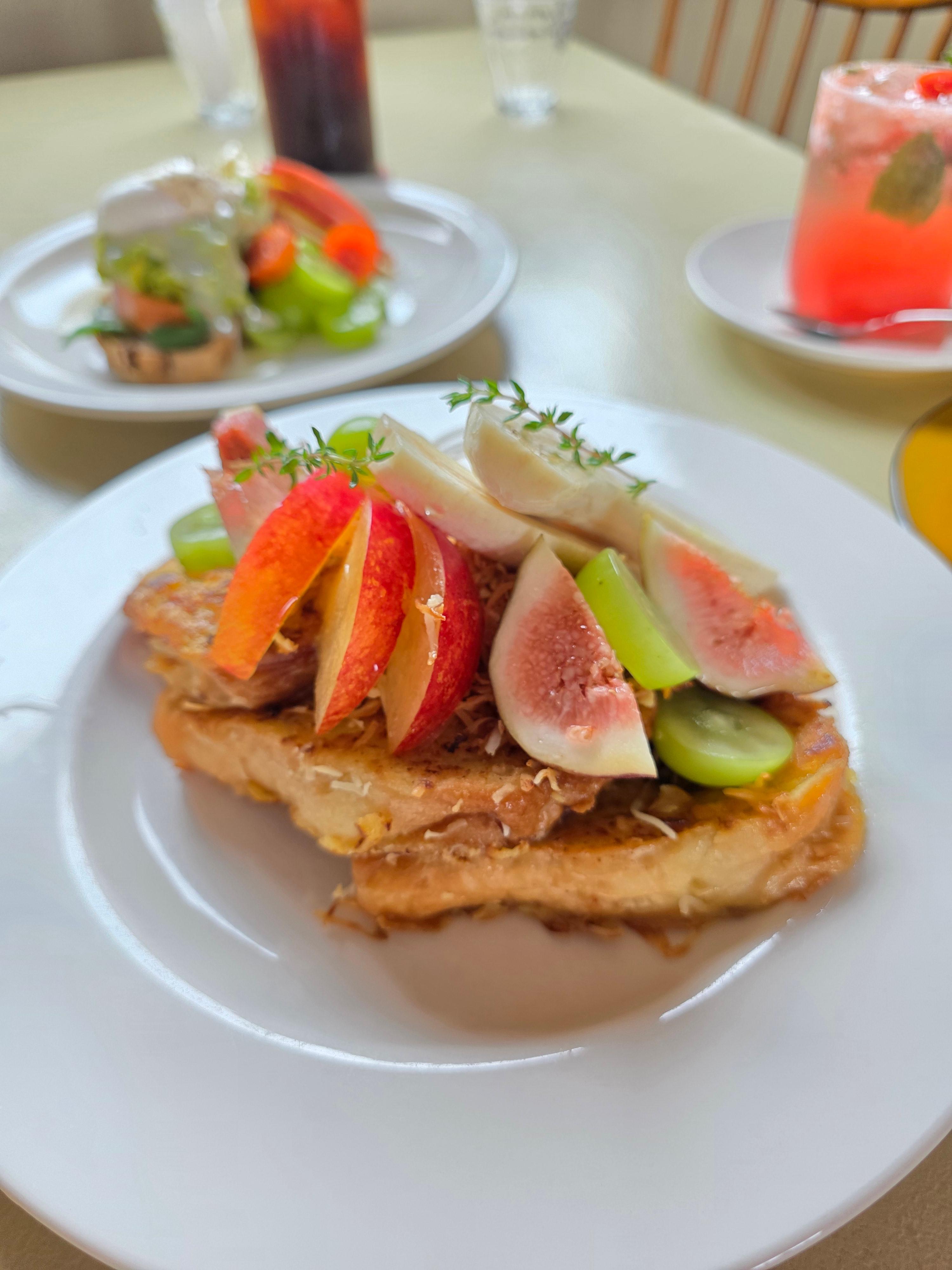프렌치토스트는 겉은 바삭하고 속은 촉촉했으며 코코넛 향이 은은하게 올라와서 고급스러운 달콤함이 느껴졌습니다.