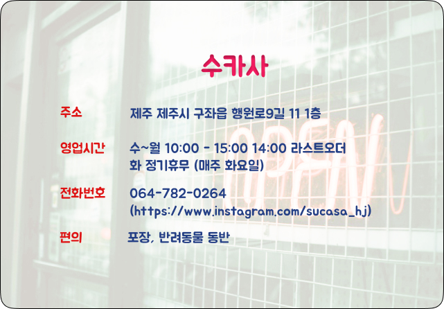 수카사는 단순히 브런치를 먹는 곳이 아니라, 제주에서의 시간을 천천히 즐길 수 있는 공간이었습니다.