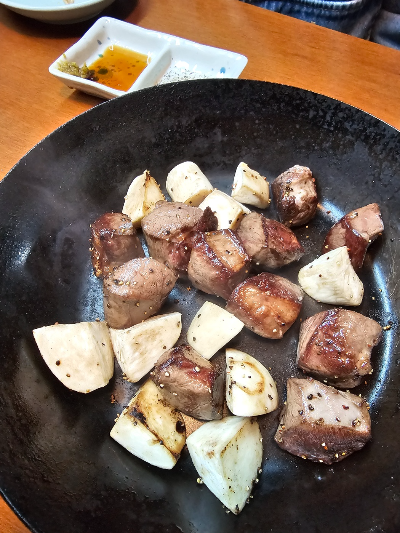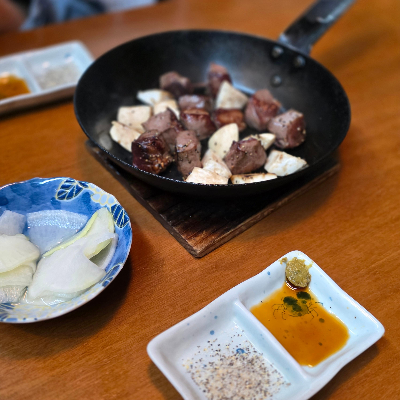다음은 염통구이, 하츠야키가 나왔어요. 큐브 스테이크처럼 작게 썰어 구워냈는데, 겉은 노릇하고 속은 촉촉한 게 아주 기분 좋게 씹히는 식감이에요. 염통 특유의 고소한 맛을 살리면서도 질기지 않아서, 고추냉이나 유자 폰즈 소스와 함께 먹으면 정말 소고기 스테이크 같은 맛이 느껴졌어요.