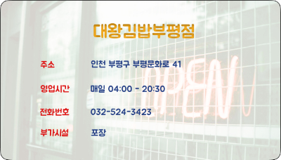 바로 *부평역 근처에 있는 "대왕김밥"이라는 곳인데요, 이름부터 강렬하죠?